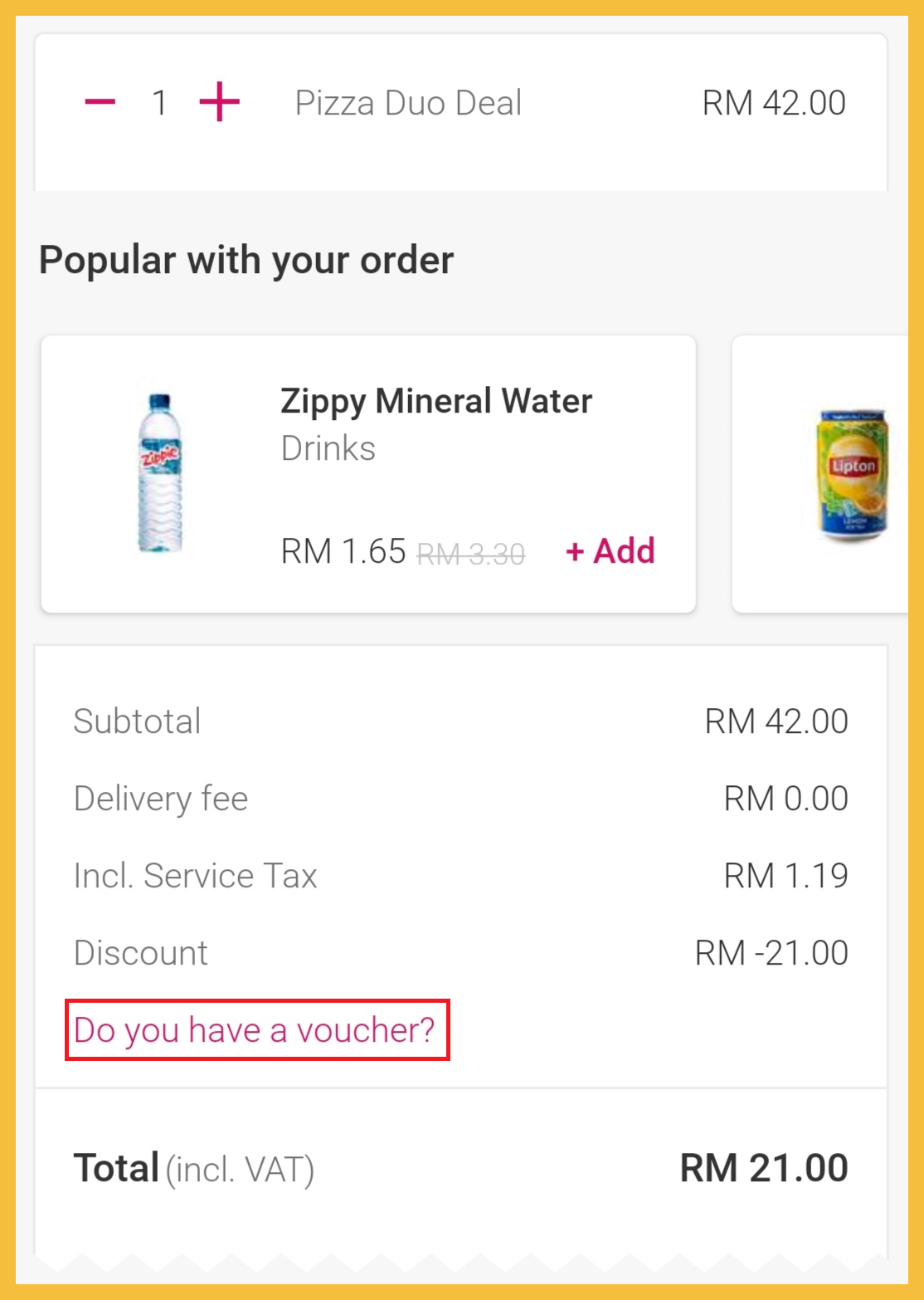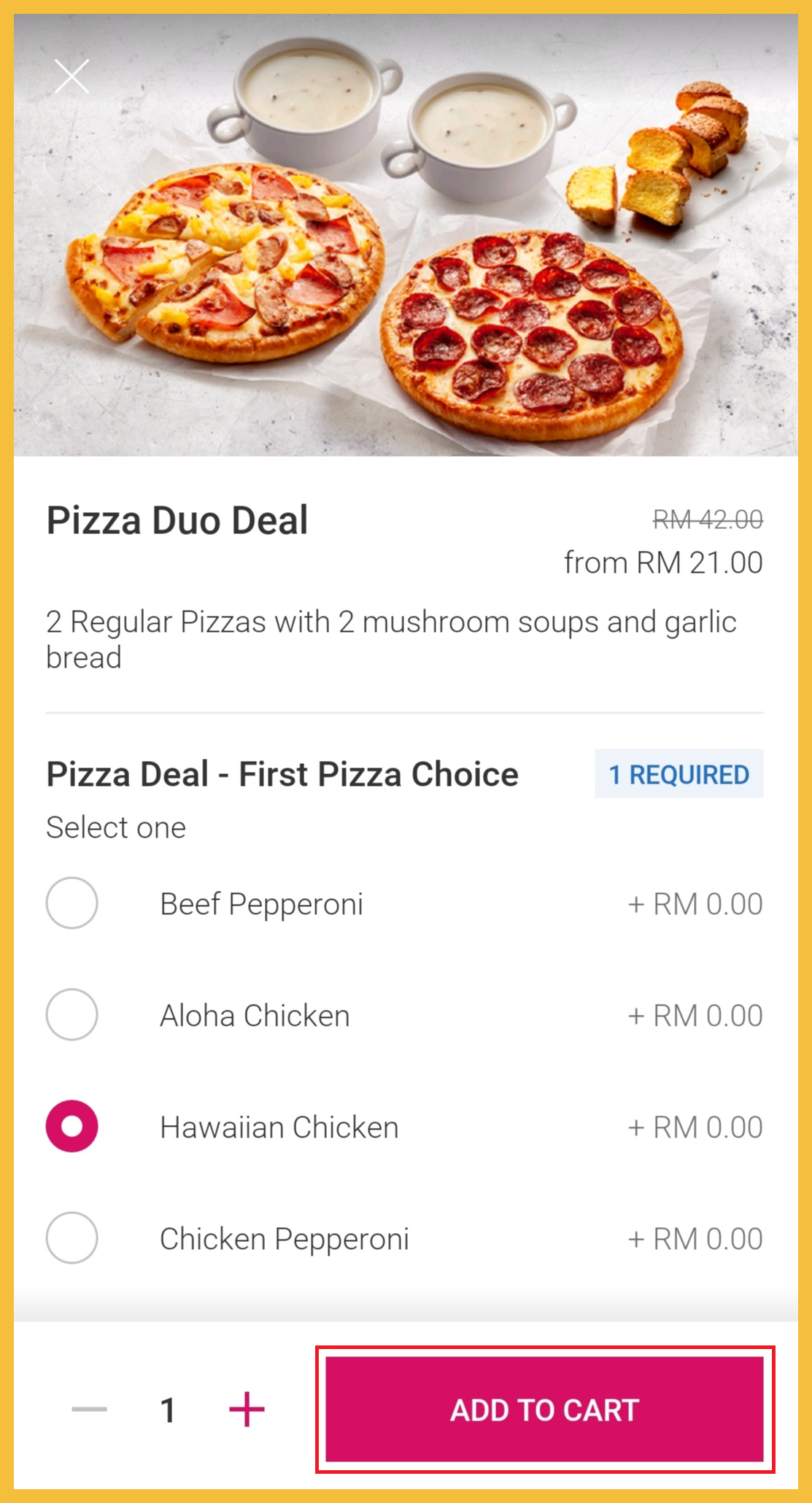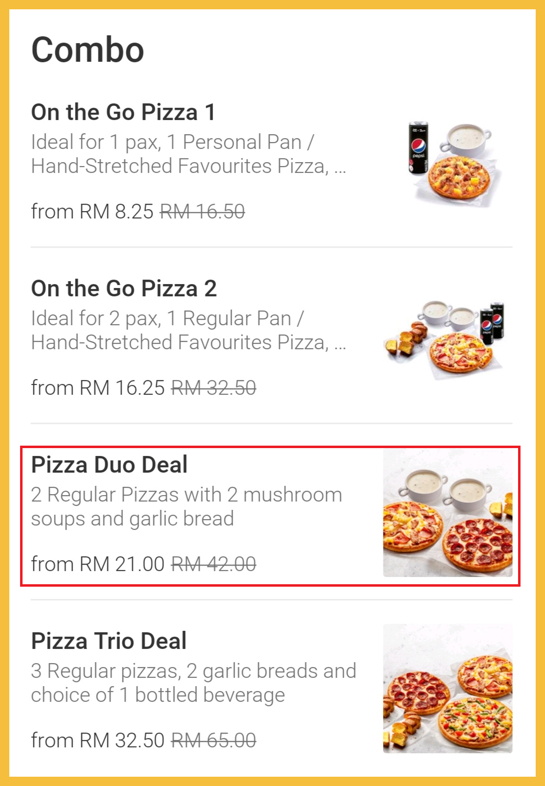 步骤 1:打开你的 Foodpanda App,搜索出「Pizza Hut」后选择你想要的食物或套餐。例如:Pizza Duo Deal。