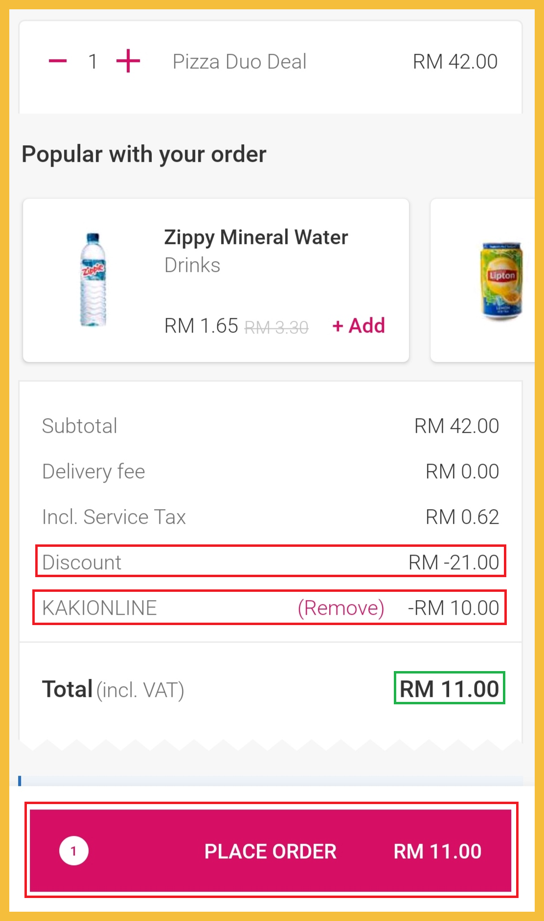 ※ 2份 Regular Pizza 原价 RM42 折扣50%+【KAKIONLINE】RM10后,只需RM11!相等于1份Pizza只需RM5.50,一人份才RM2.75!真的是太划算呢?!