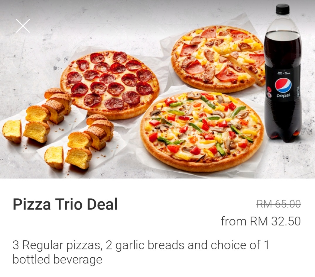 ▼ 3份 Regular Pizza + 2份蒜蓉面包 + 1瓶1.5L汽水原价RM65,折扣后只需RM22.50!