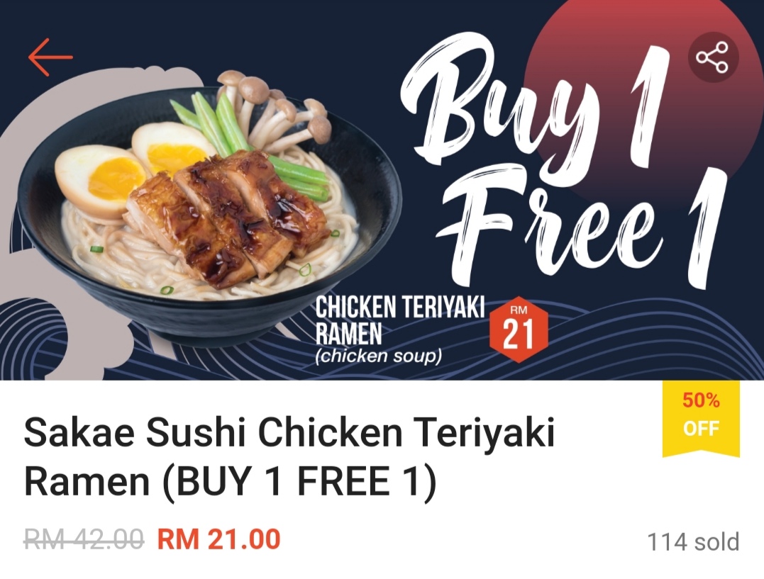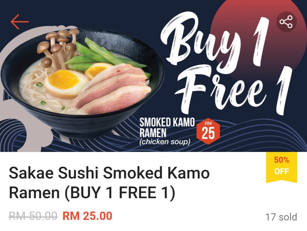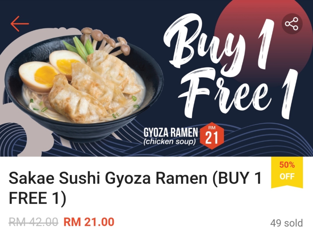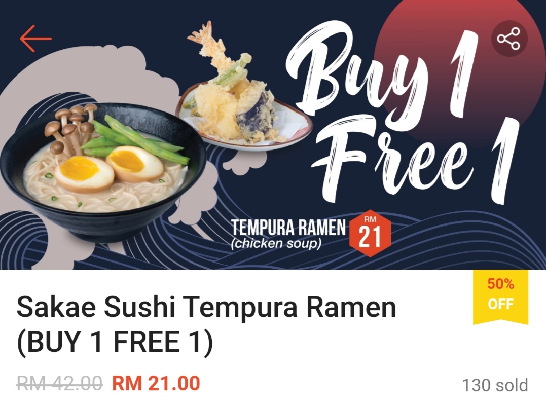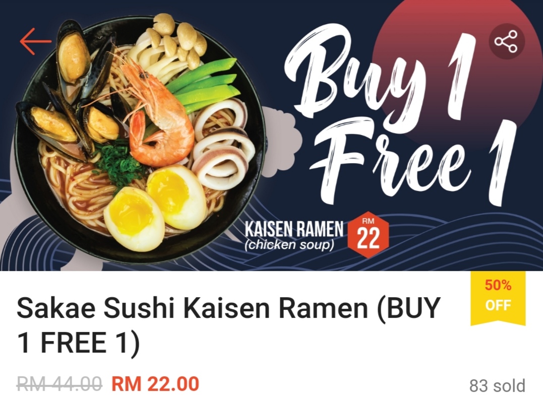 这项优惠是由 Sakae Sushi 与 Shopee 联合推出买一送一超值优惠券!不管是海鲜、日式饺子、Tempura等拉面都享有买一送一哦!