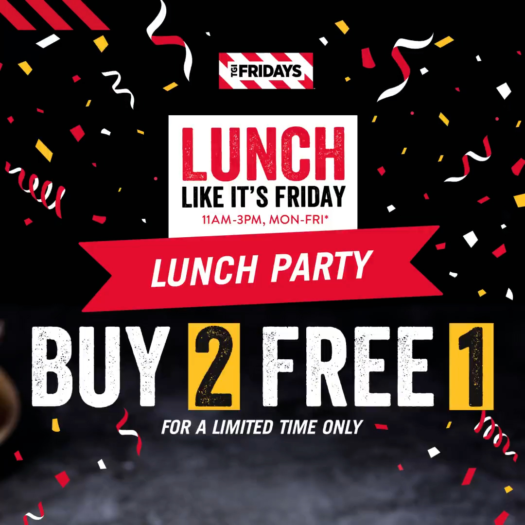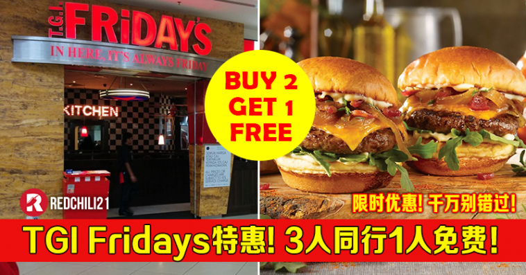 如今 TGI Friday 推出午餐派对特大优惠!三人同行,一人免费哦!