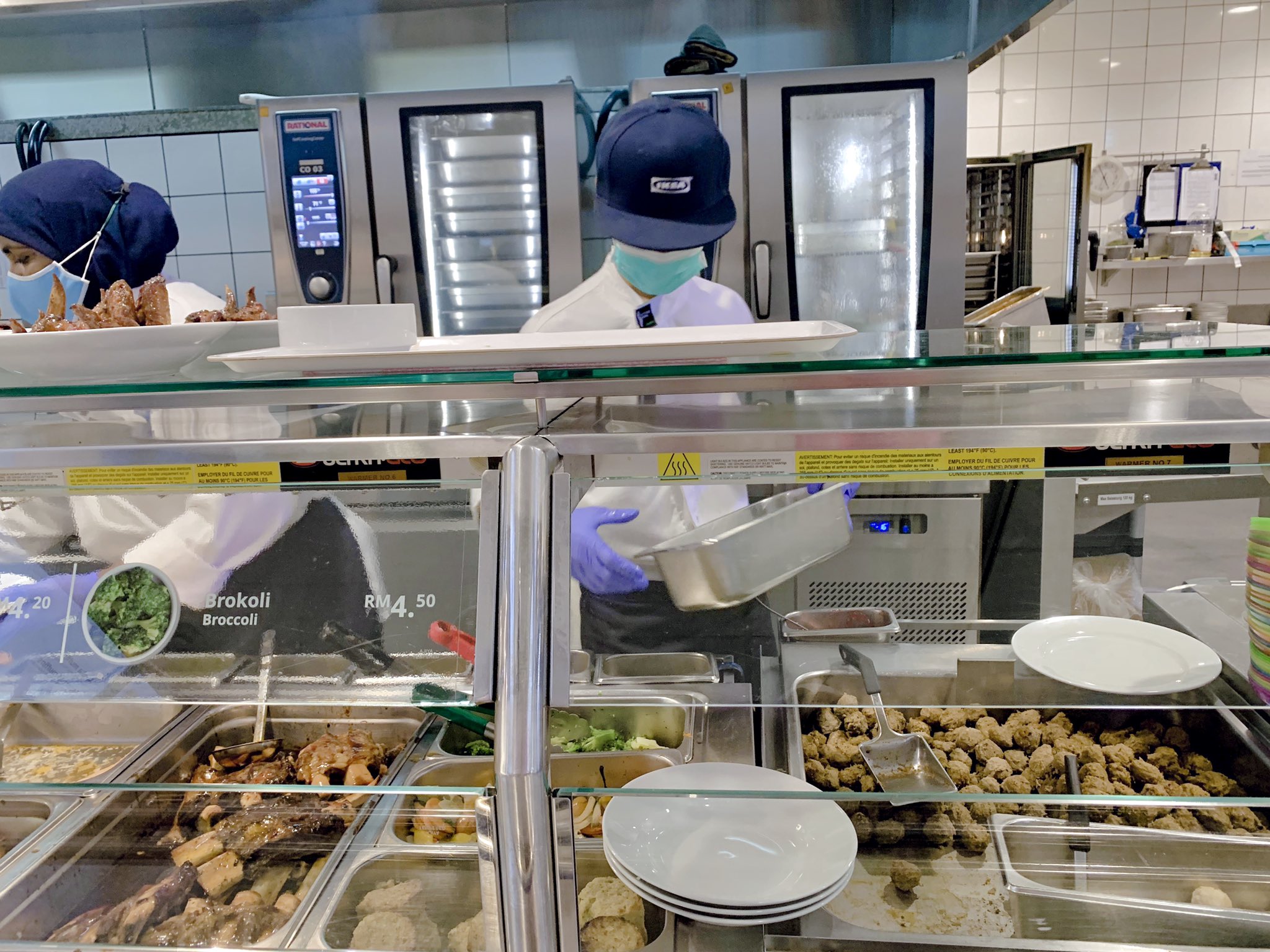 如果想要购买许多种不同的餐点,首先就要像我这样,推一辆小推车去排队。接着就领取杯子和餐盘。有些食物顾客可以自己拿,有些则必须由工作人员服务与提供。