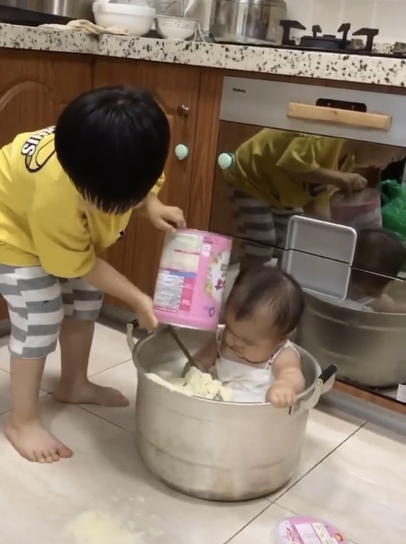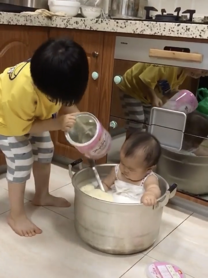 ▼ 视频的一开始,穿着黄色衣服的小男孩拿着一支汤勺,蹲在妹妹旁边玩。仔细一看,妹妹整个人都泡在一大锅的水里,旁边还有一罐开着盖的奶粉。
