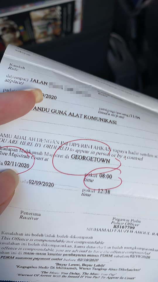 警察:「Selamat petang, kesalahan U ialah menguna alat konunikasi semasa memandu. Sila pergi mahkamah kat Georgetown dengan bayar RM1000 duit denda. (下午好!您触犯了驾驶时使用电子产品的法规。请到法庭缴付 RM1000 的罚款。)」