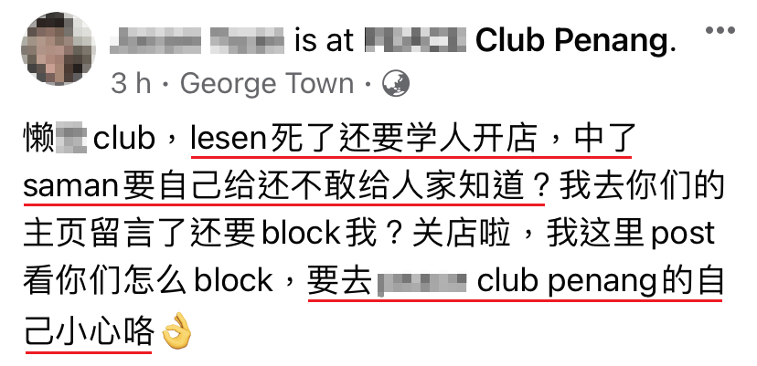 随后就在今天,一名大马男子也在面子书发文抱怨,去 Club “蹦迪”结果被“抓个正着” 罚款 RM1000!男子竟然怪罪夜店老板因为“Lesen死了”才害得他“无辜Saman”!