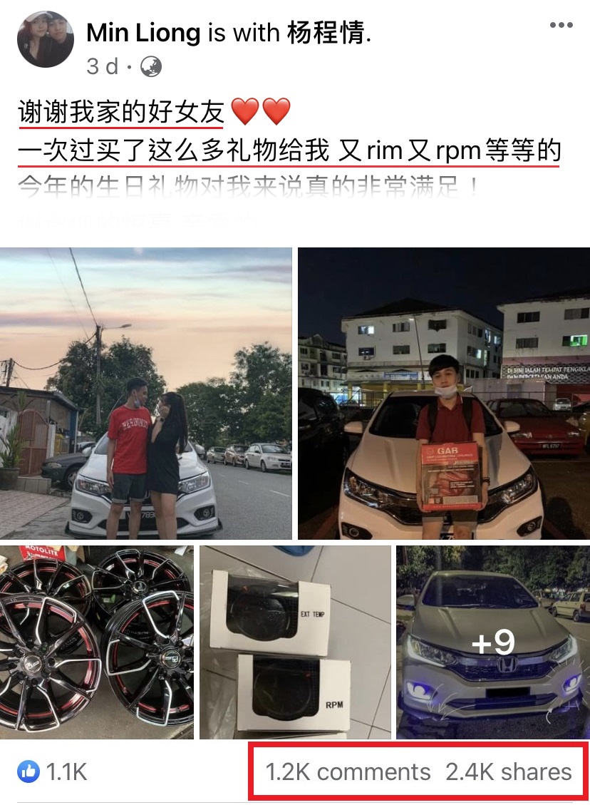 近日一名大马男子就在面子书发文分享自己的生日礼物,女友花钱送他改装车子的配备,让男网友们看了都超级羡慕!