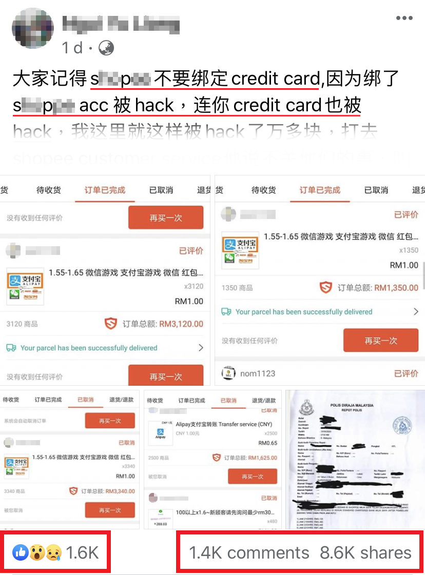 近日一名大马网友在面子书群组分享自己的经历,绑定信用卡在其中一个购物平台 App 里,结果惨遭骇客入侵,损失超过RM10,000!