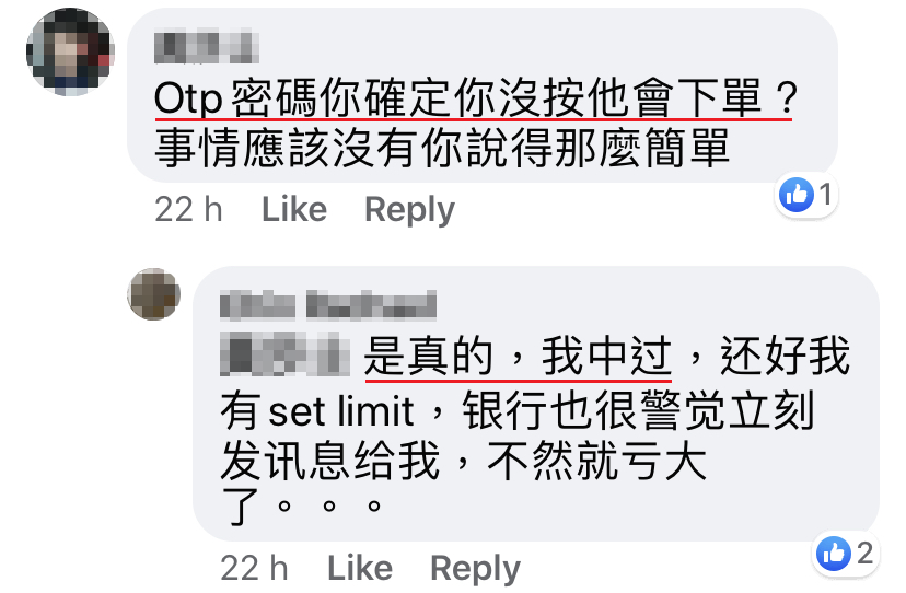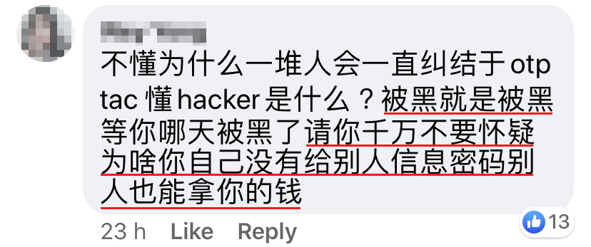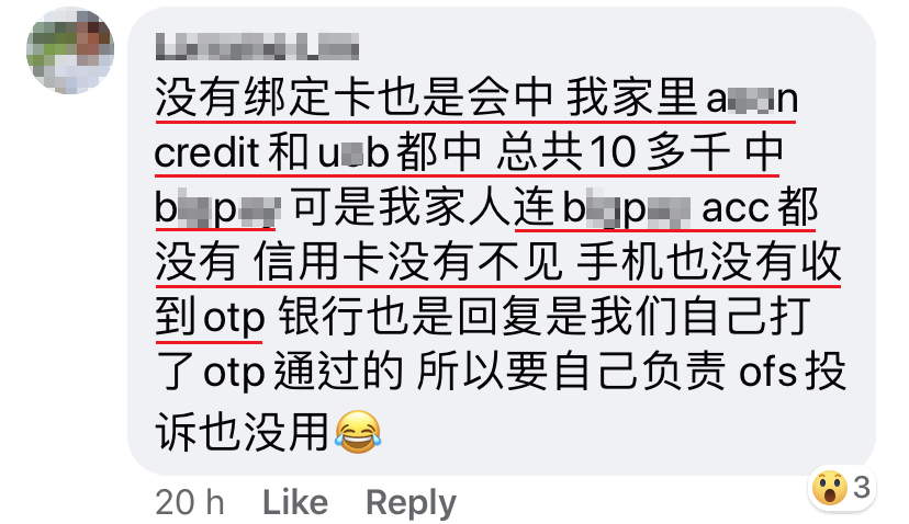 我这里就这样被 hack 了万多块,打去 Sxxpxx customer service,他说不关他们的事,叫我打给Sxxxdxxx Cxxxtxxxx bank。结果银行不认账,说是我自己把 OTP 打进去过账的,要我自己付这一万多块的账。到现在只能 pass 去 OFS,至今都没有下文。