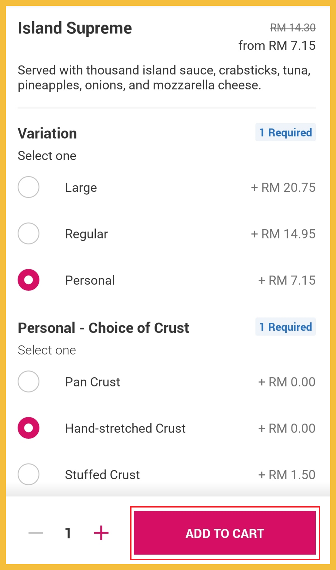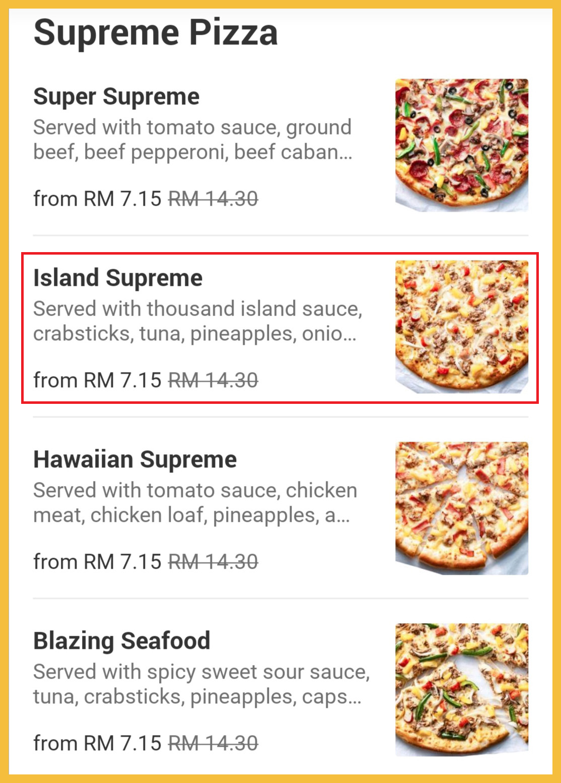 步骤 1:打开你的 Foodpanda App,搜索出「Pizza Hut」后选择你想要的食物或套餐。例如:Island Supreme。