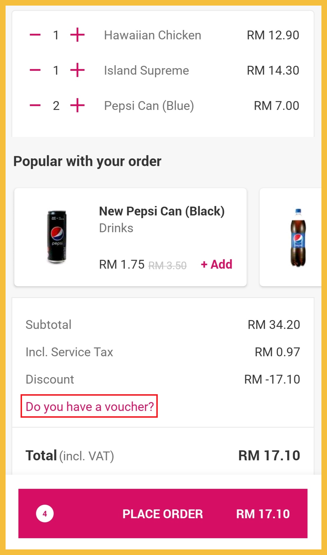 ※ 此时,系统显示出折扣50%后的价钱,但先别急着下单!你还可额外获得RM6折扣!