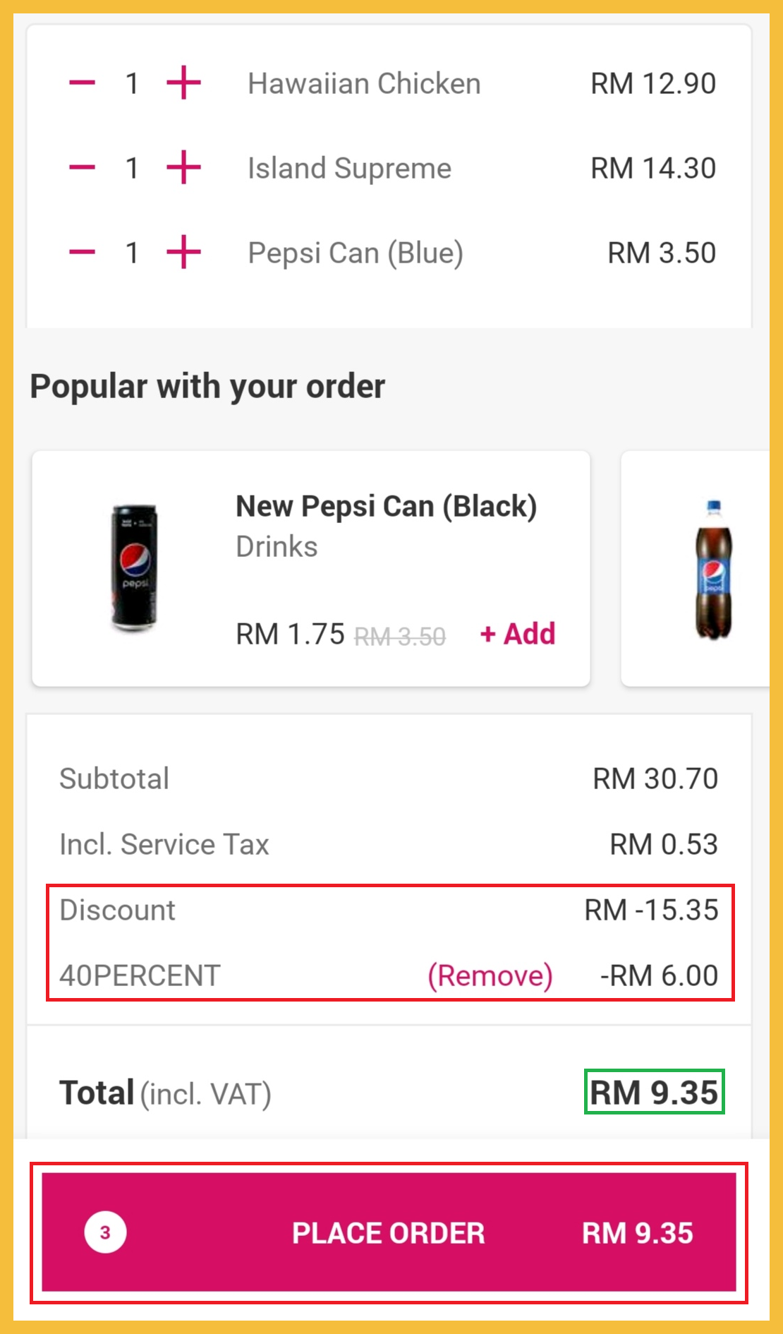 ※ 2份Personal Pizza+汽水原价RM30.70,折扣50%+【40PERCENT】的RM6后,只需RM9.35!小编是使用Pick-up方式,所以没有征收任何Delivery 费用!