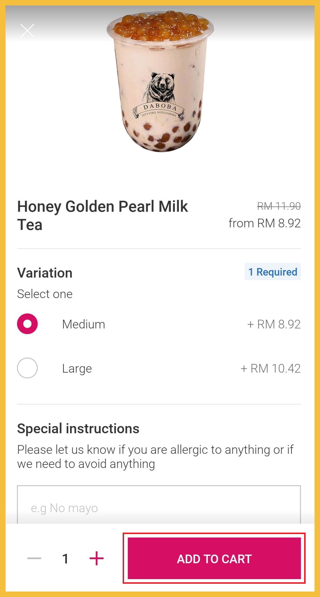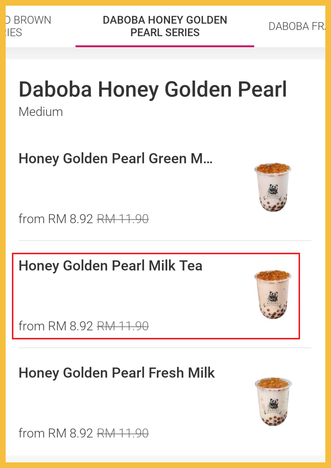 步骤1:打开 Foodpanda 手机App,寻出「Daboba」后选择你想喝的饮料,例如:Honey Golden Pearl Milk Tea。