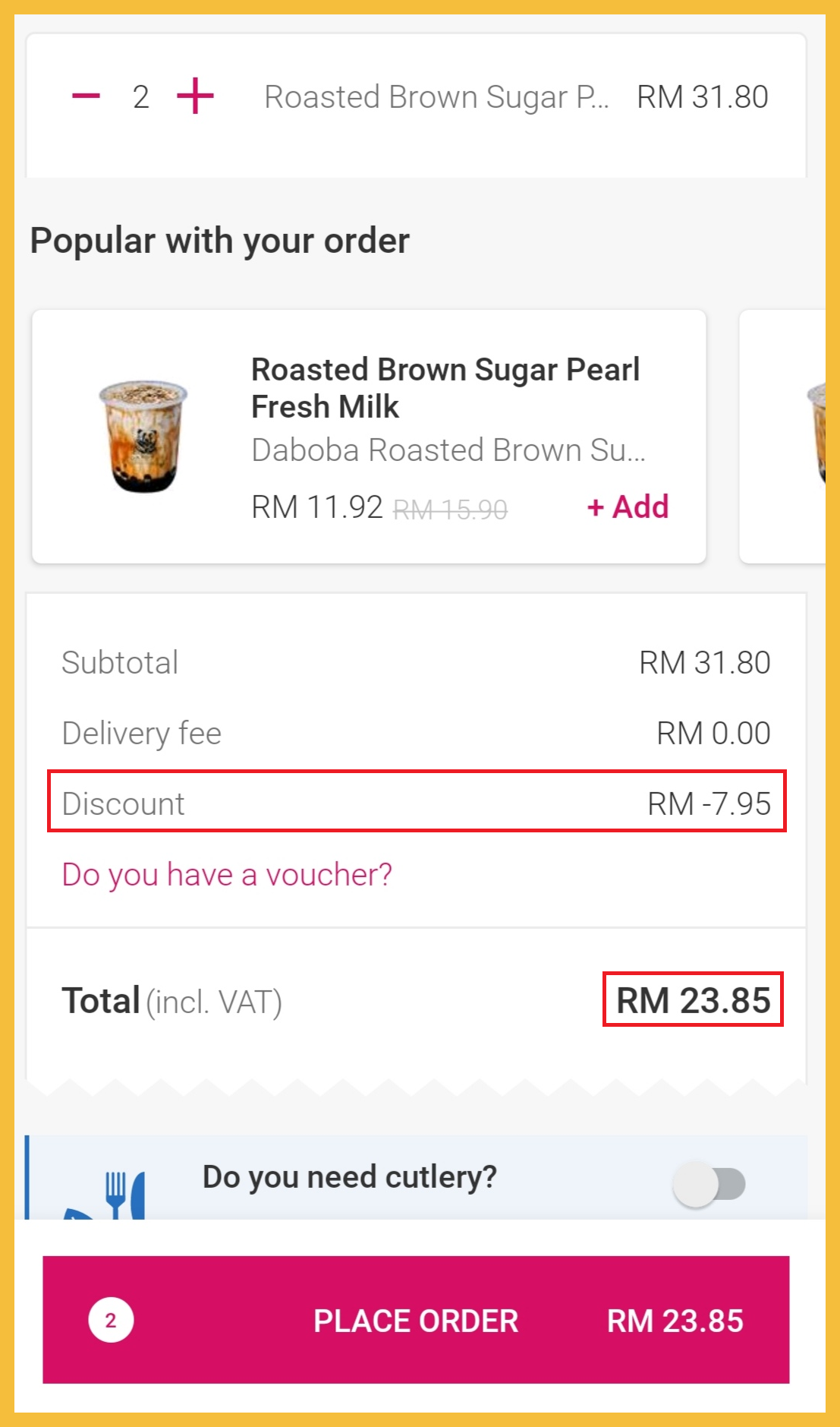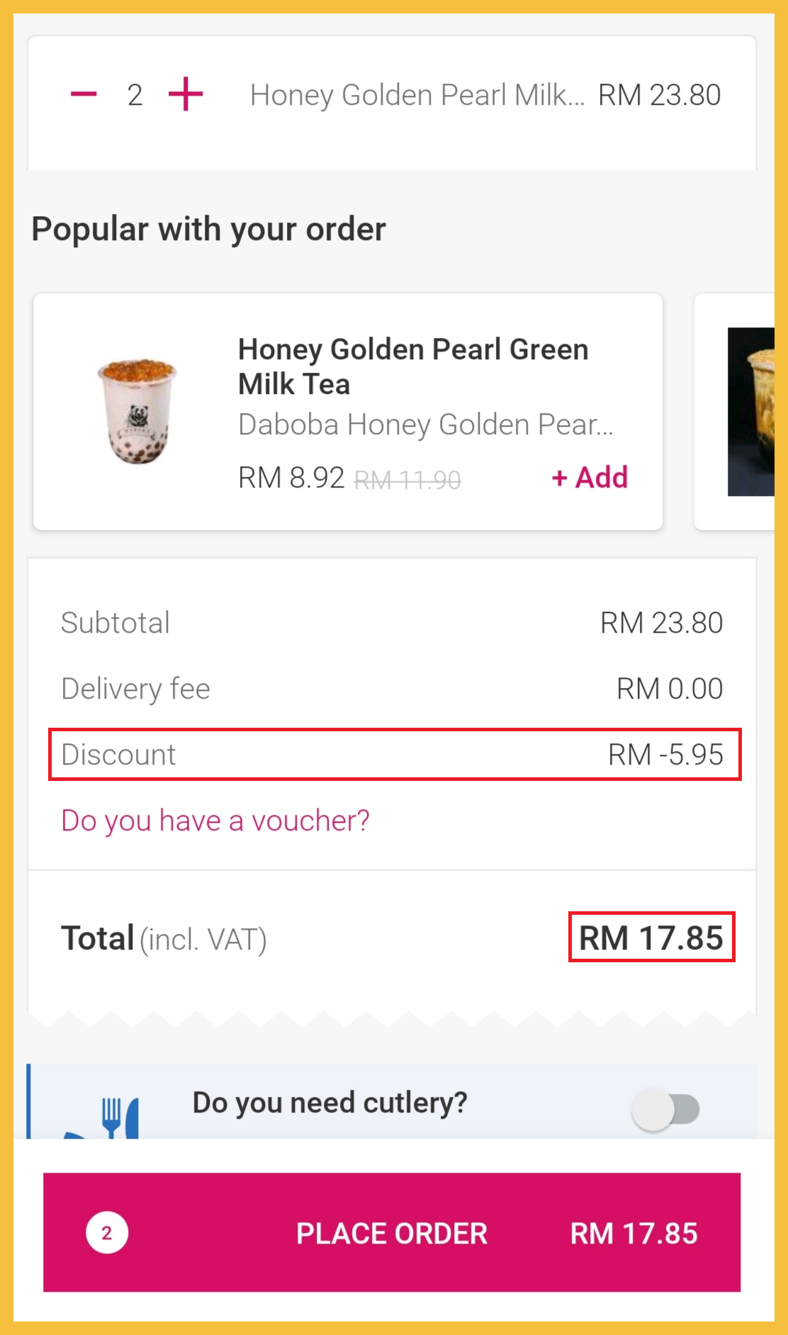 ※ 此时,你会发现系统已经折扣25%。2杯Honey Golden Pearl Milk Tea 饮料只需RM17.85(平均一杯只需RM8.93)