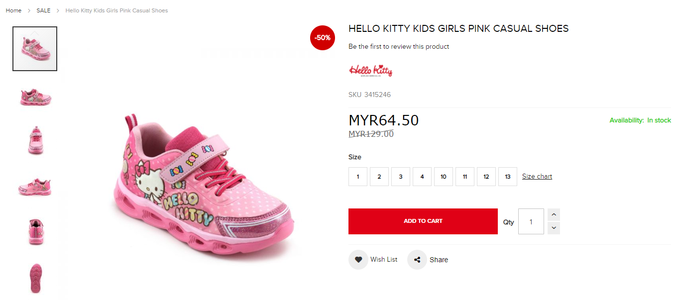 ▼ HELLO KITTY KIDS GIRLS PINK CASUAL SHOES —— 只需RM64.50(原价RM129)