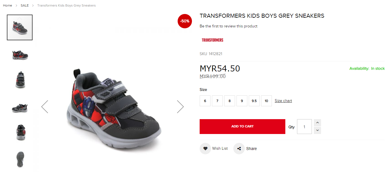 ▼ TRANSFORMERS KIDS BOYS GREY SNEAKERS —— 只需RM54.50(原价RM109)