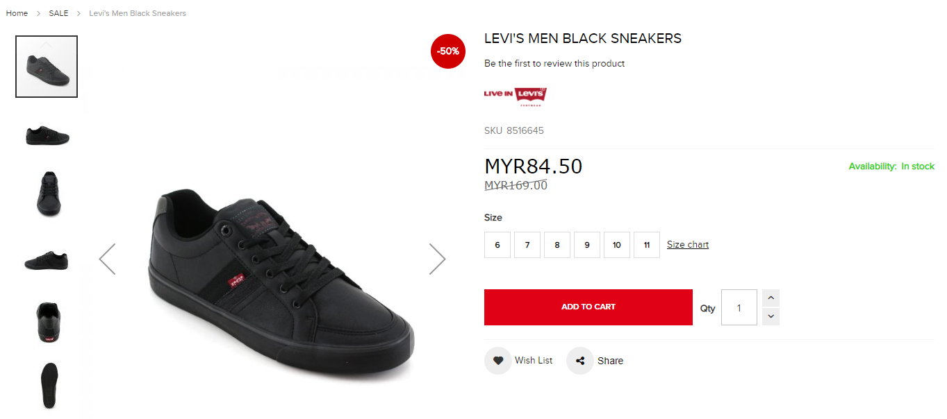 ▼ LEVI’S MEN BLACK SNEAKERS —— 只需RM84.50(原价RM169)