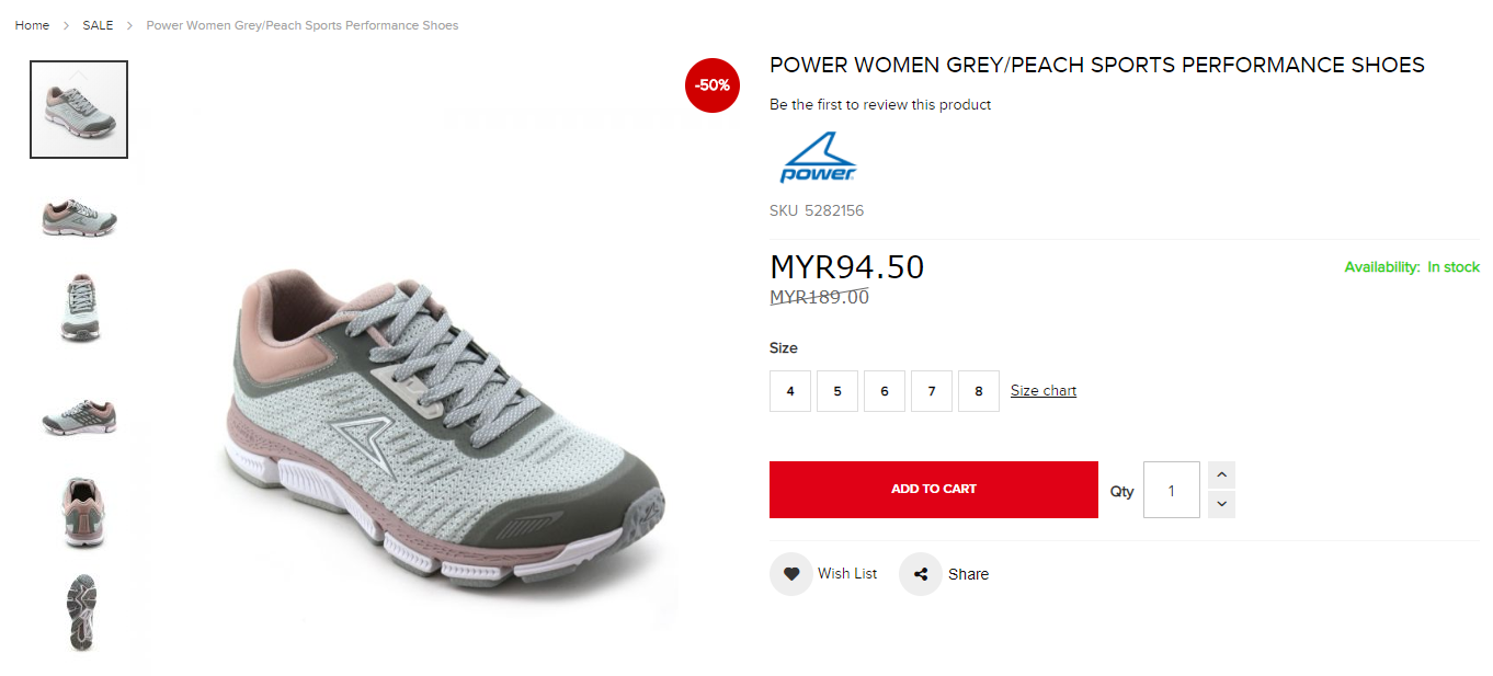 ▼ POWER WOMEN GREY/PEACH SPORTS PERFORMANCE SHOES —— 只需RM94.50(原价RM189)