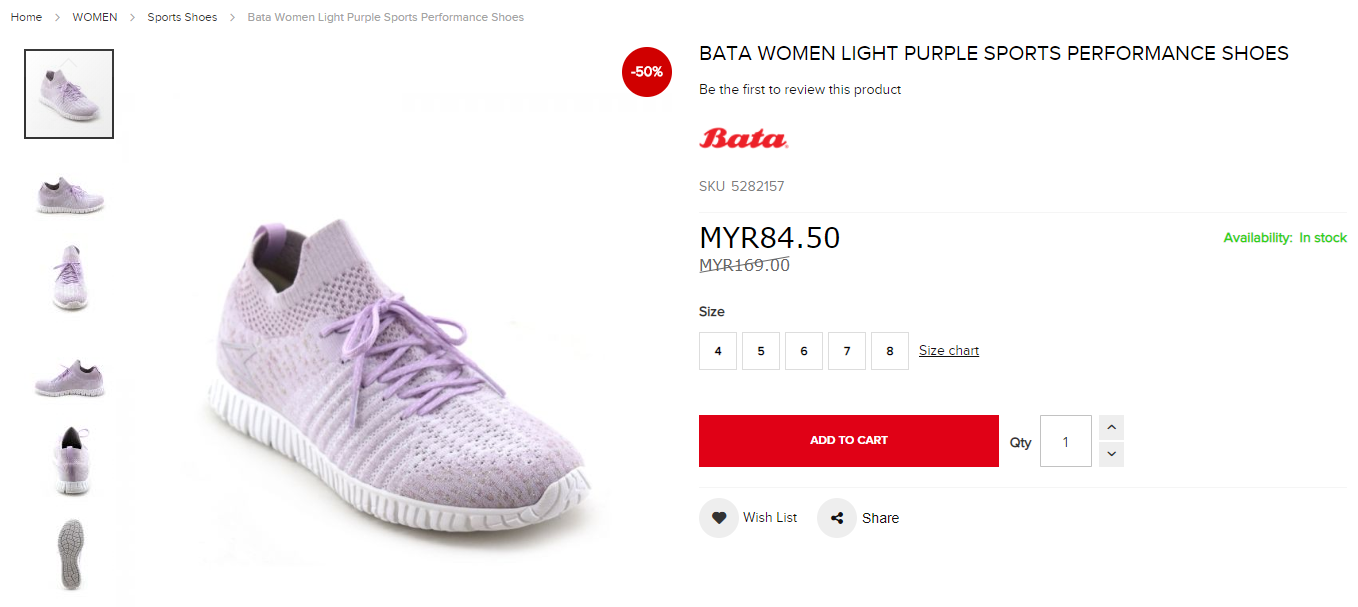 ▼ BATA WOMEN LIGHT PURPLE SPORTS PERFORMANCE SHOES —— 只需RM84.50(原价RM169)