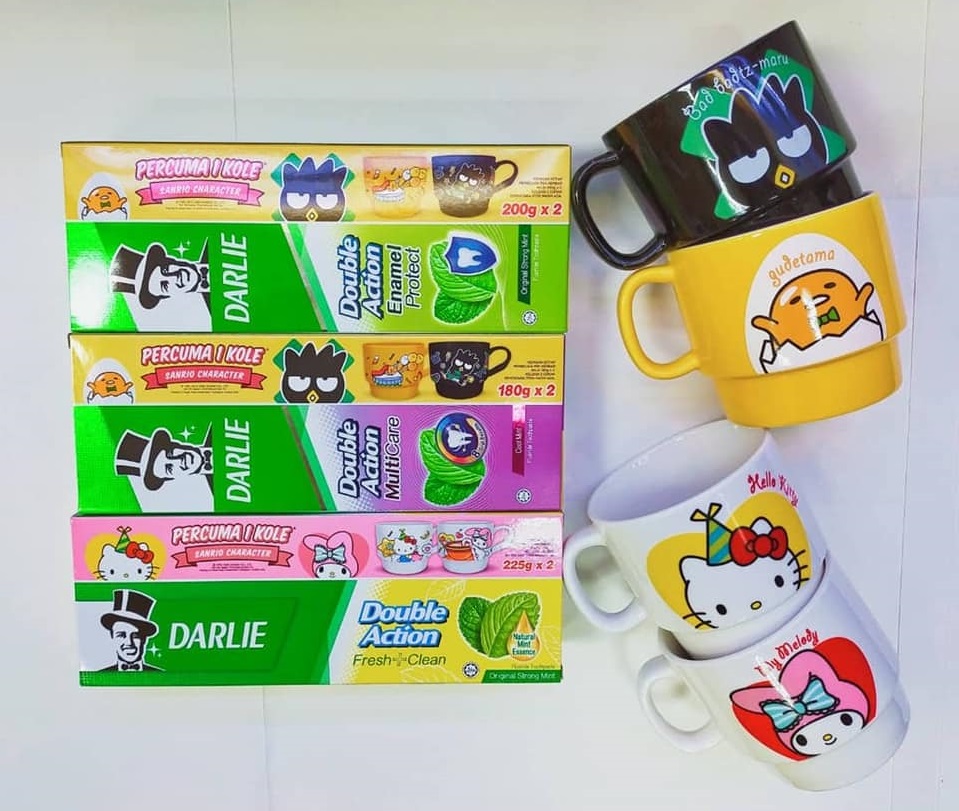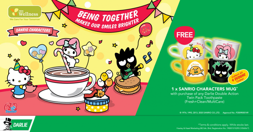 即日起在Aeon Wellness 购买特定 Darlie Double Action twin pack 牙膏即可免费获取一个精美的Sanrio 角色瓷杯!
