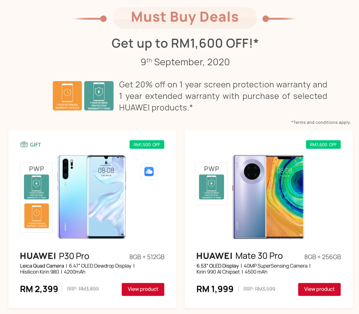 ▼ 之前看中 Huawei Mate 30Pro手机的朋友,如今只需RM1999(原价RM3599)