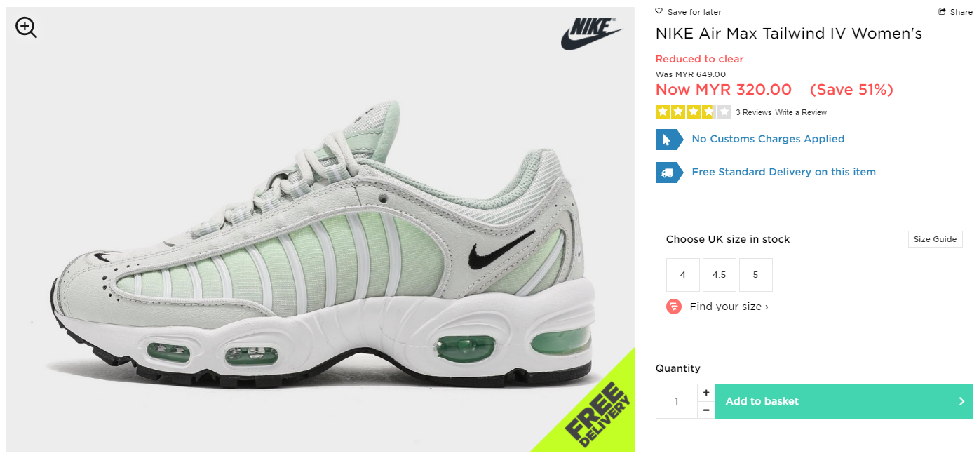 ▼ NIKE Air Max Tailwind IV Women’s – 只需RM320(原价 RM649)!