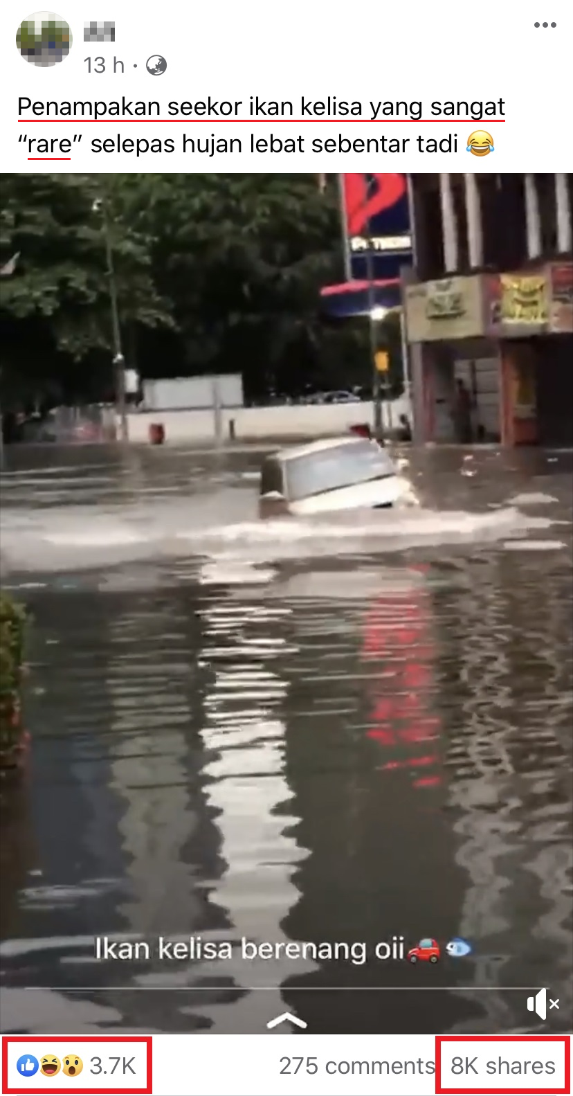 该帖文在短短13个小时内,就获得8000次分享和3千多人点赞!贴主分享视频时写道:「经过刚才的大雨以后,非常难得可以看到一条“金龙鱼”(ikan kelisa)在水中游走!」Kelisa 的独场秀终于来啦~
