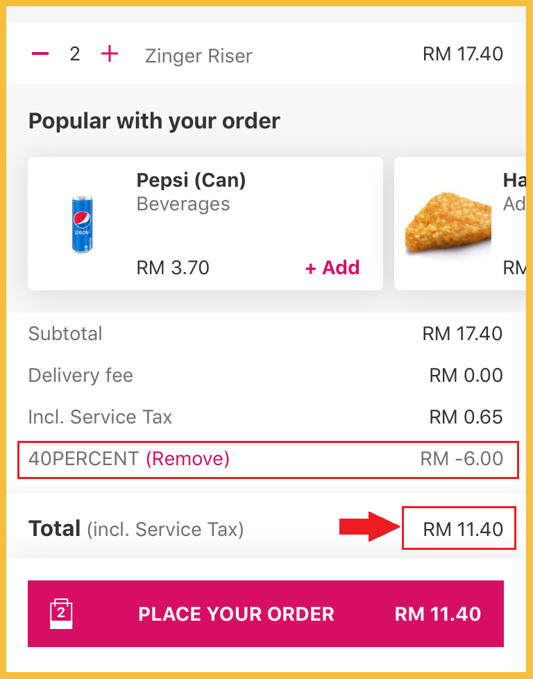 ※2x Zinger Riser折扣40% 后只需RM11.40,那么算起来1粒Zinger Riser 就只需RM5.70 而已哦!(注意:每个地区都会征收不相同的外送费用)