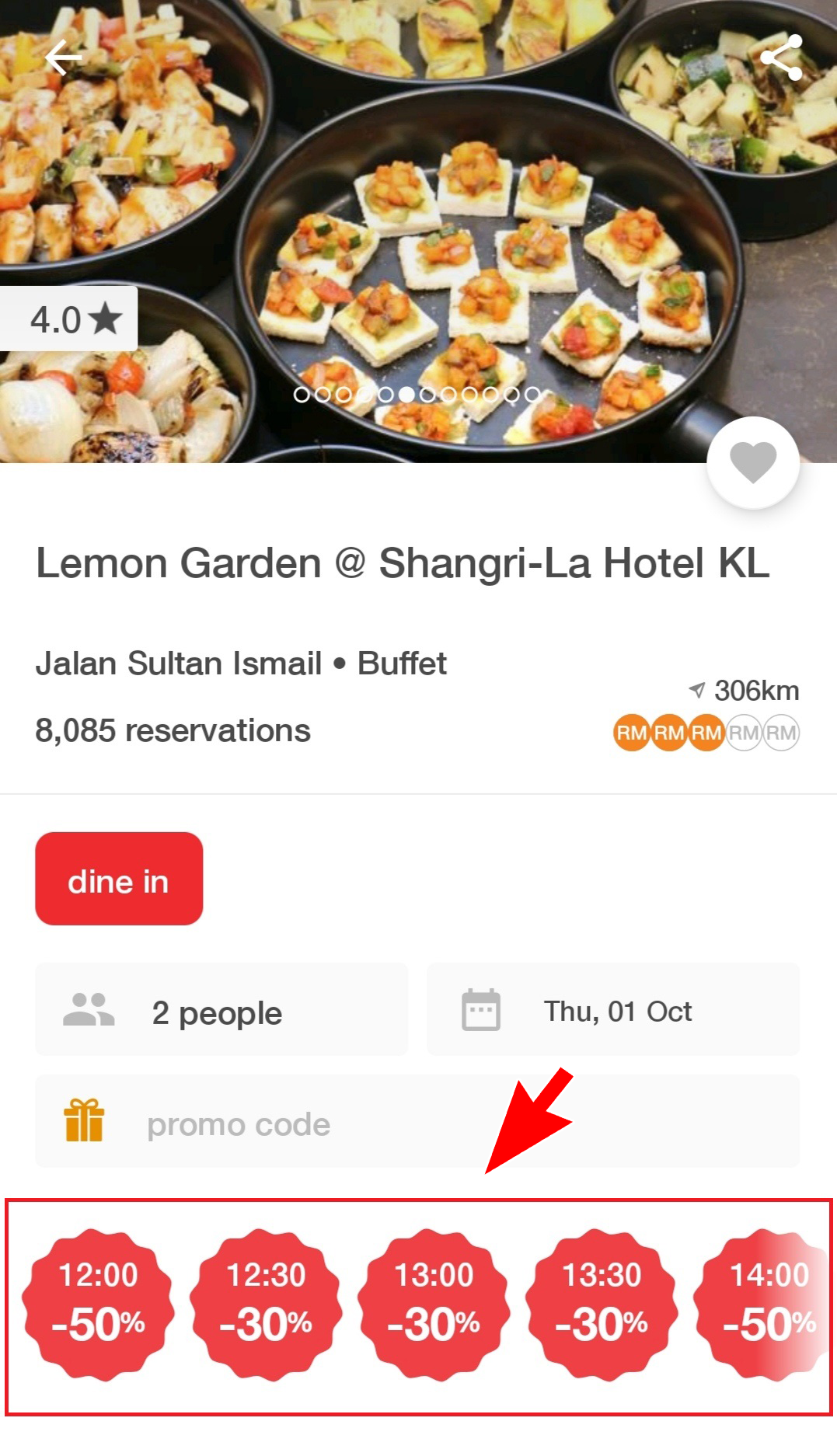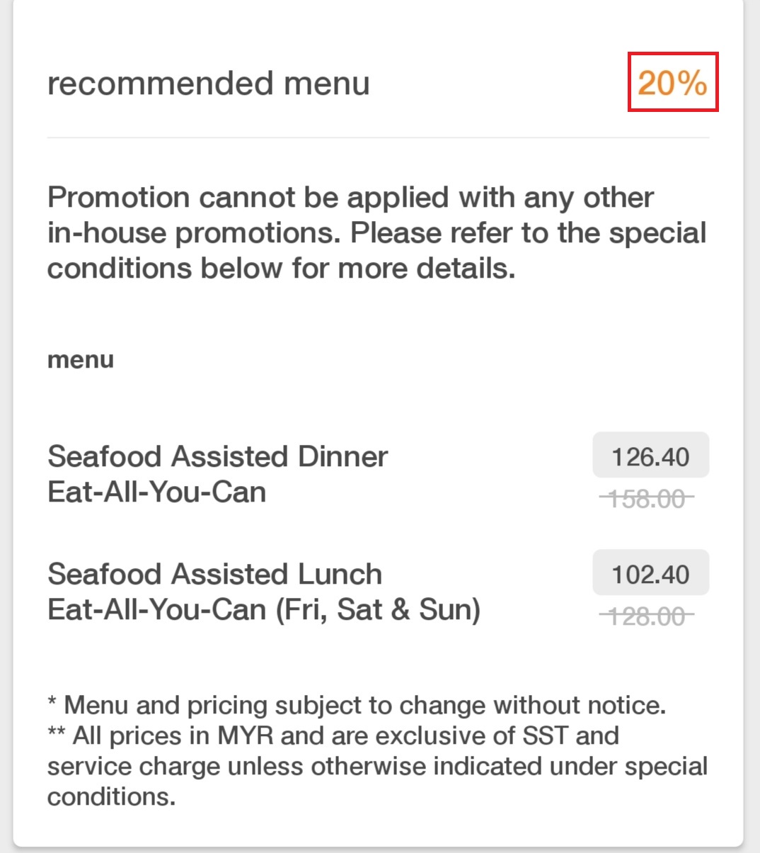 - 午餐自助餐——折扣50%只需RM102.40(原价RM128)
