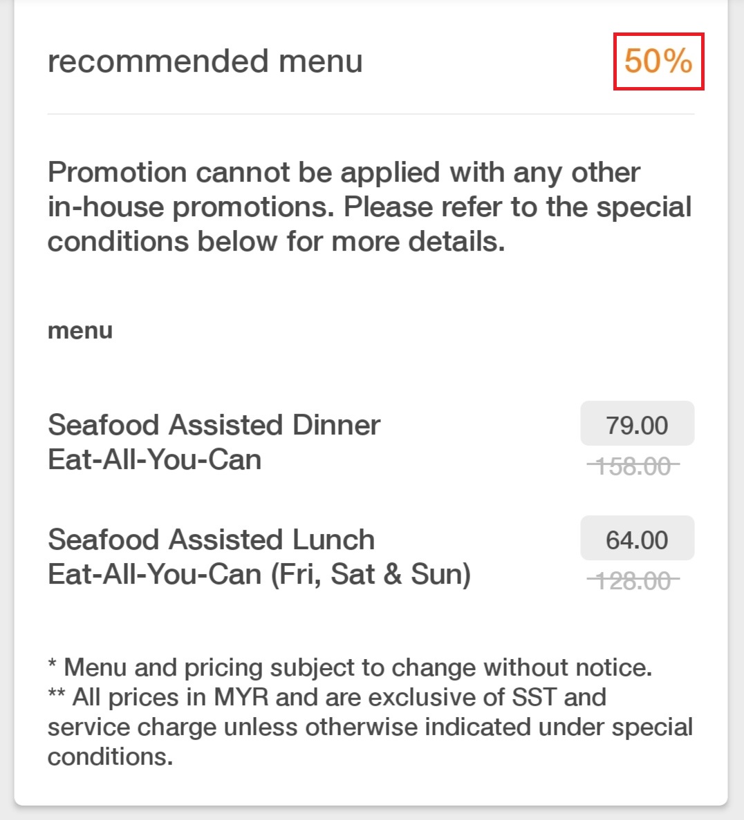 - 晚餐自助餐——折扣50%只需RM79(原价RM158)