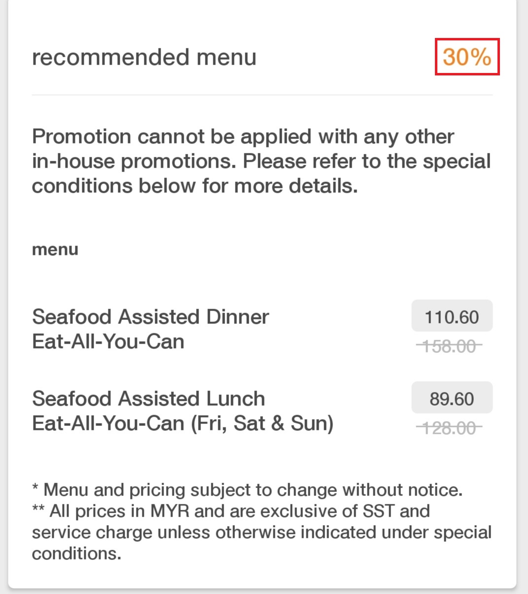 - 晚餐自助餐——折扣30%只需RM110.60(原价RM158)