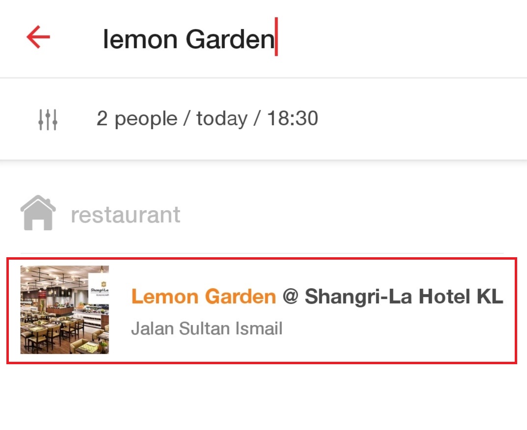 步骤2:搜索Lemon Garden @ Shangri-La Buffet