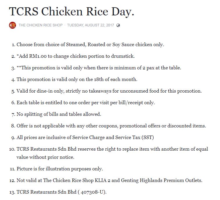 促销地点:全马 The Chicken Rice Shop 分行(除了 KLIA2 和 Genting Highlands)