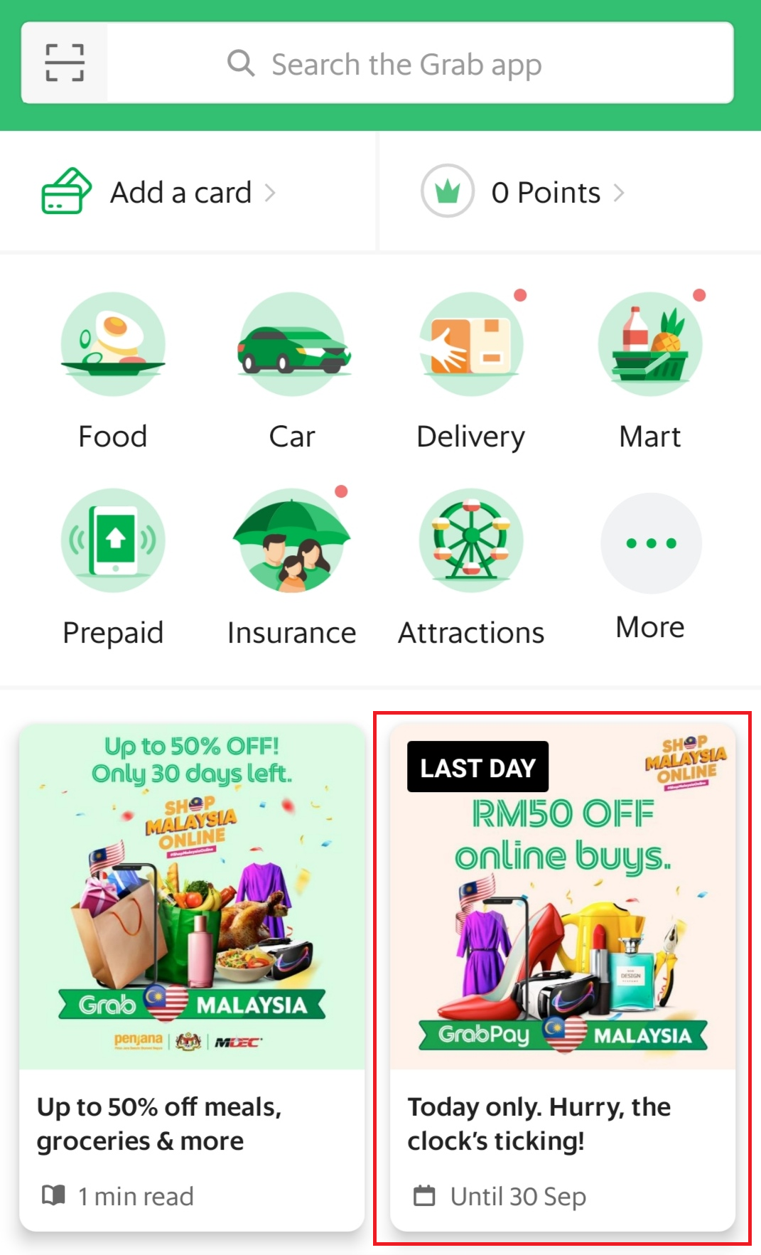 步骤1:下载或打开Grab App,点击「RM50 OFF ONLINE BUYS」的优惠。