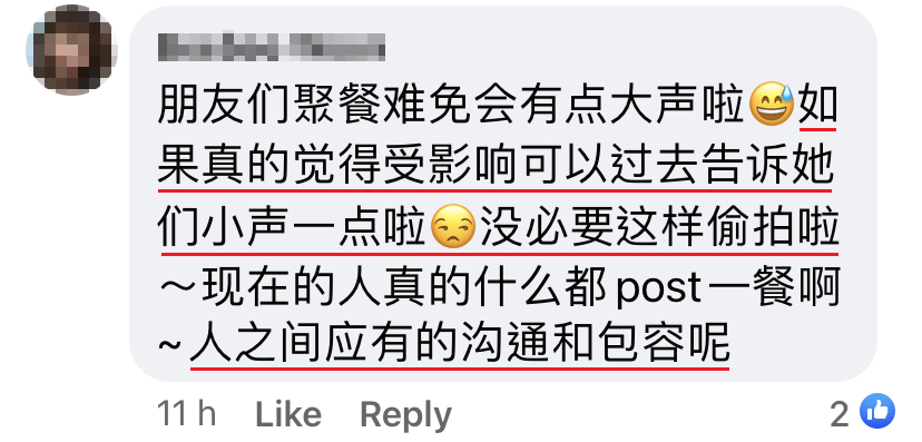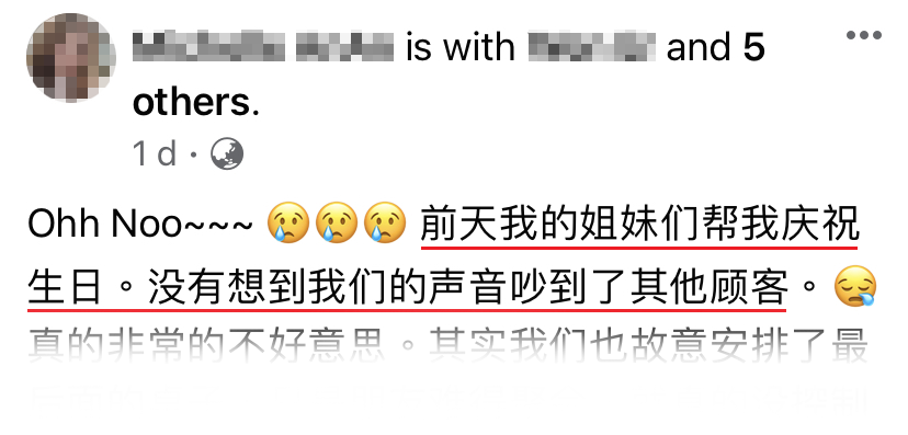 近日一名大马网友就PO文分享,和姐妹们聚在一间餐厅庆祝生日,因为声音太大,竟然被偷拍然后分享至社交媒体成为议论话题!