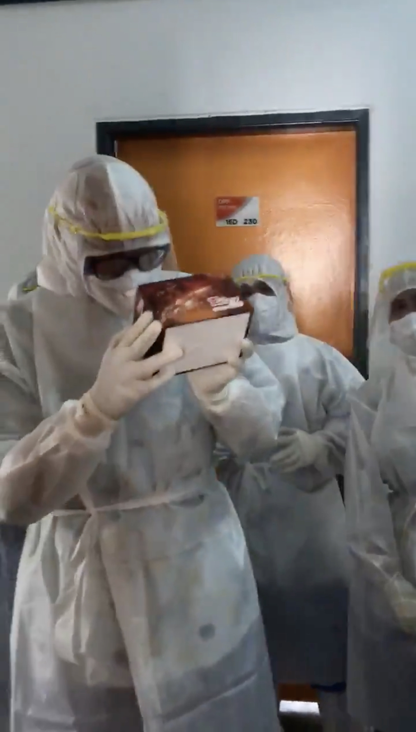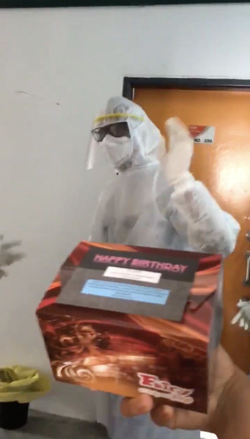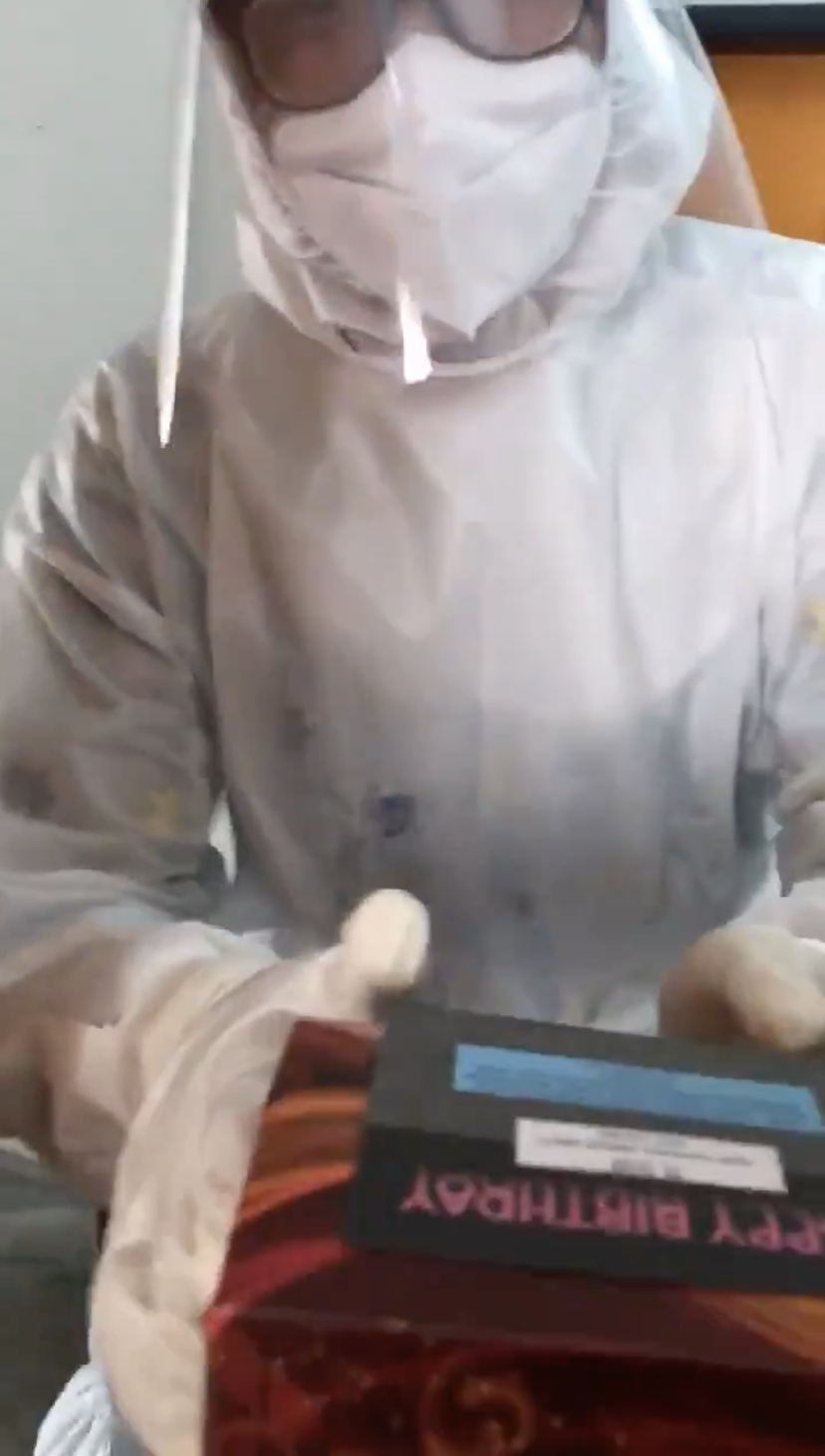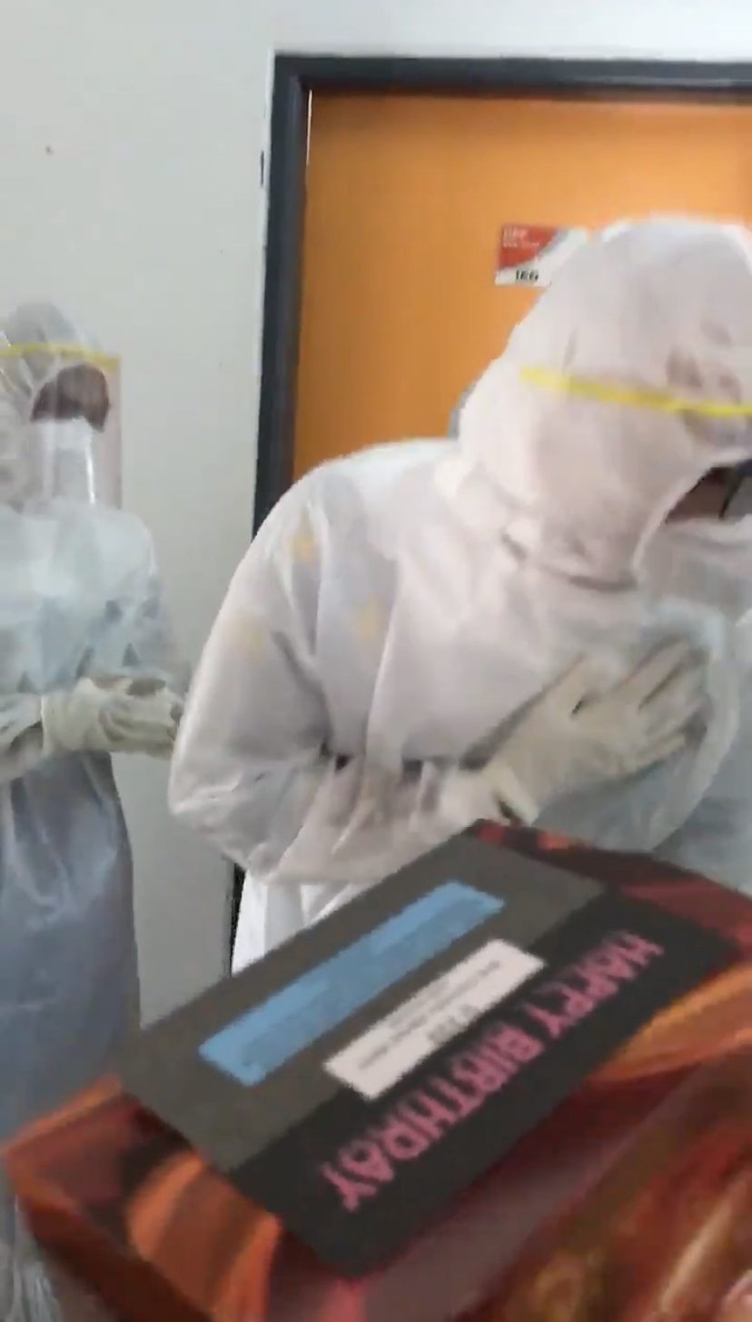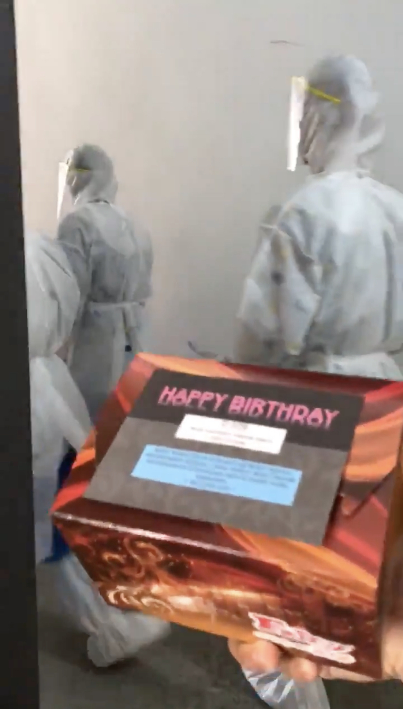 从寿星上传的16秒视频中可以看到,四位身穿着防护装备的前线人员站在房间门口,其中一位手拿着装着蛋糕的盒子。寿星打开房门后,前线人员就大声地一起唱英文版的《生日歌》,为正在隔离的寿星庆祝生日。