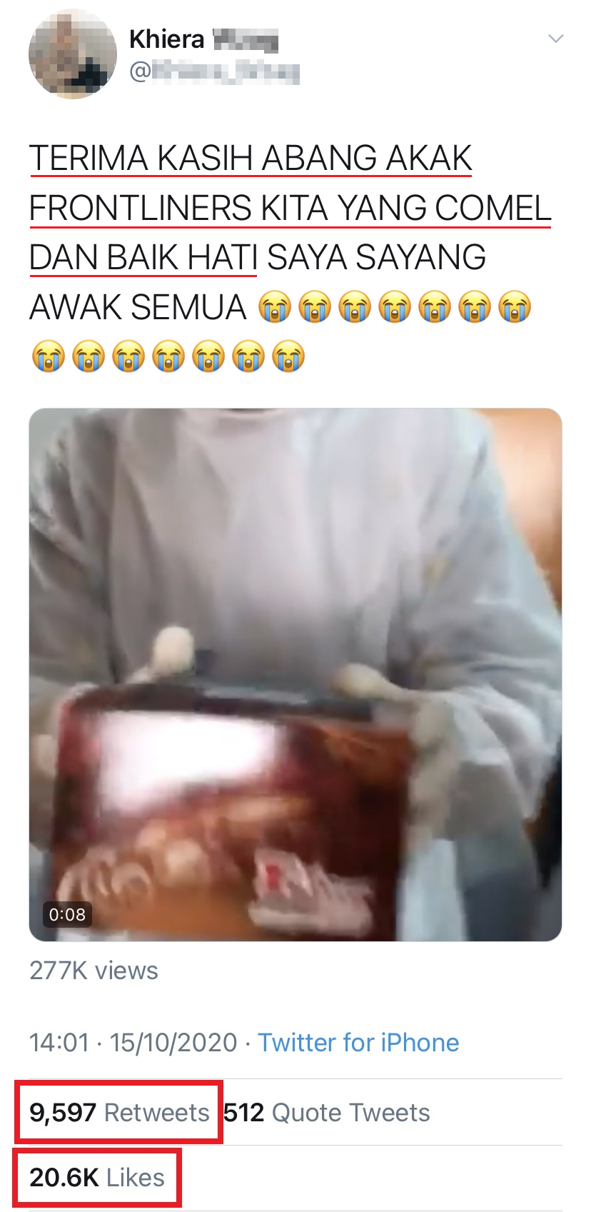 近日一则推特(Twitter)推文在网上流传,一名大马女子在隔离期间过生日,原以为今年的生日只能独自度过,没想到前线人员竟然准备了生日惊喜给她,让她感动落泪!