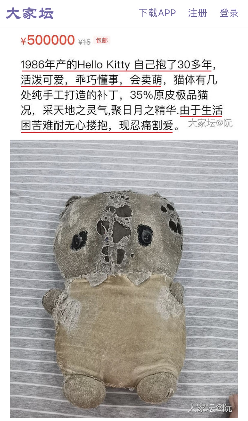 卖家在介绍内容里写道:「1986年产的Hello Kitty,自己抱了30多年,活泼可爱、乖巧懂事、会卖萌,虽然猫体有数处纯手工打造的修补痕迹,但其中有35%是原皮,采天地之灵气,聚日月之精华,由于生活困苦难耐无心搂抱,现忍痛割爱。」