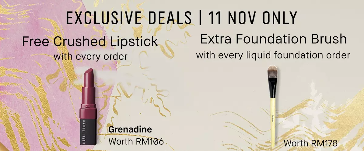 ▼ 双11当天,购买任何产品可免费获得价值RM106Crushed Lipstick,以及购买任何Liquid Foundation 可免费获得一支价值RM178 的Foundation Brush!