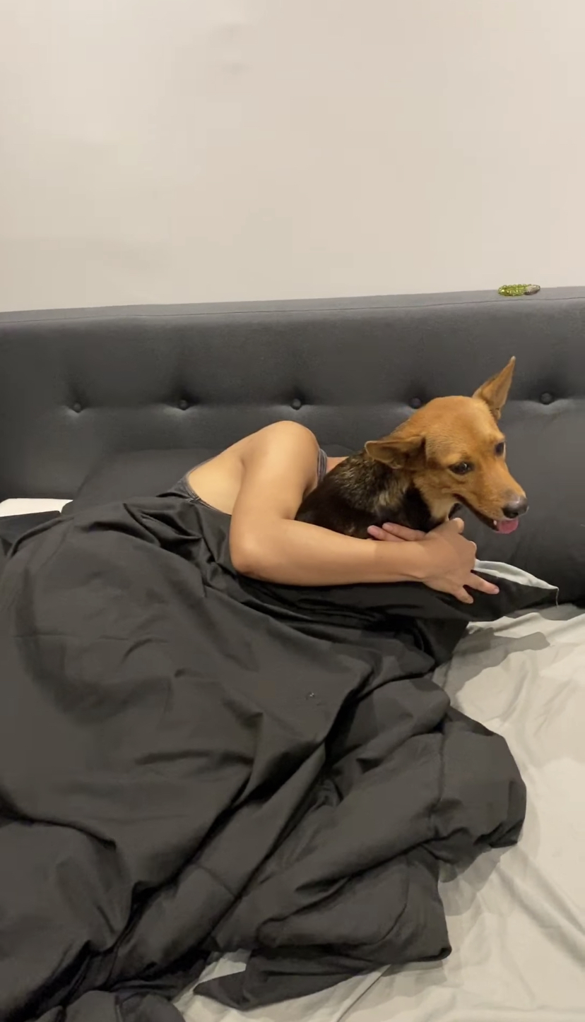 ▼ 带着黄狗回到家后,男子直接抱著这只狗在床上睡觉,他的整个过程都被朋友拍摄记录下来。