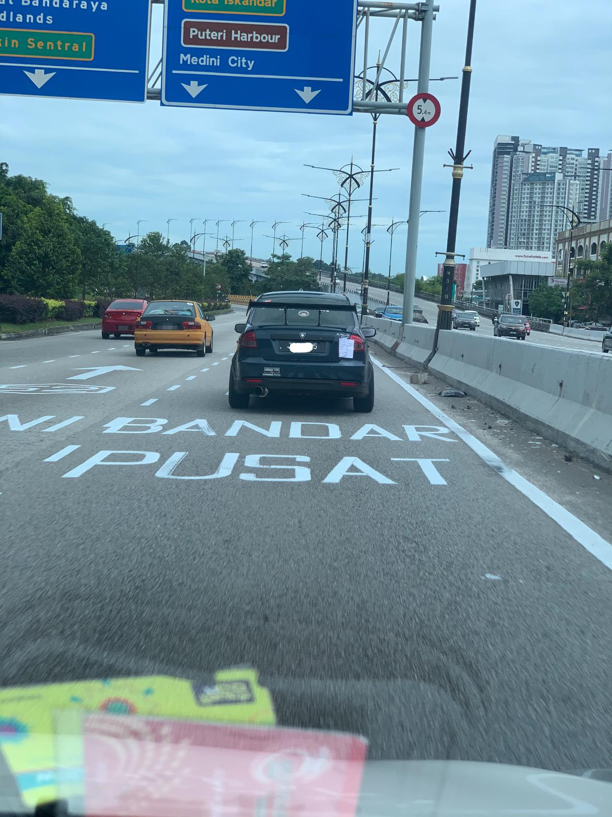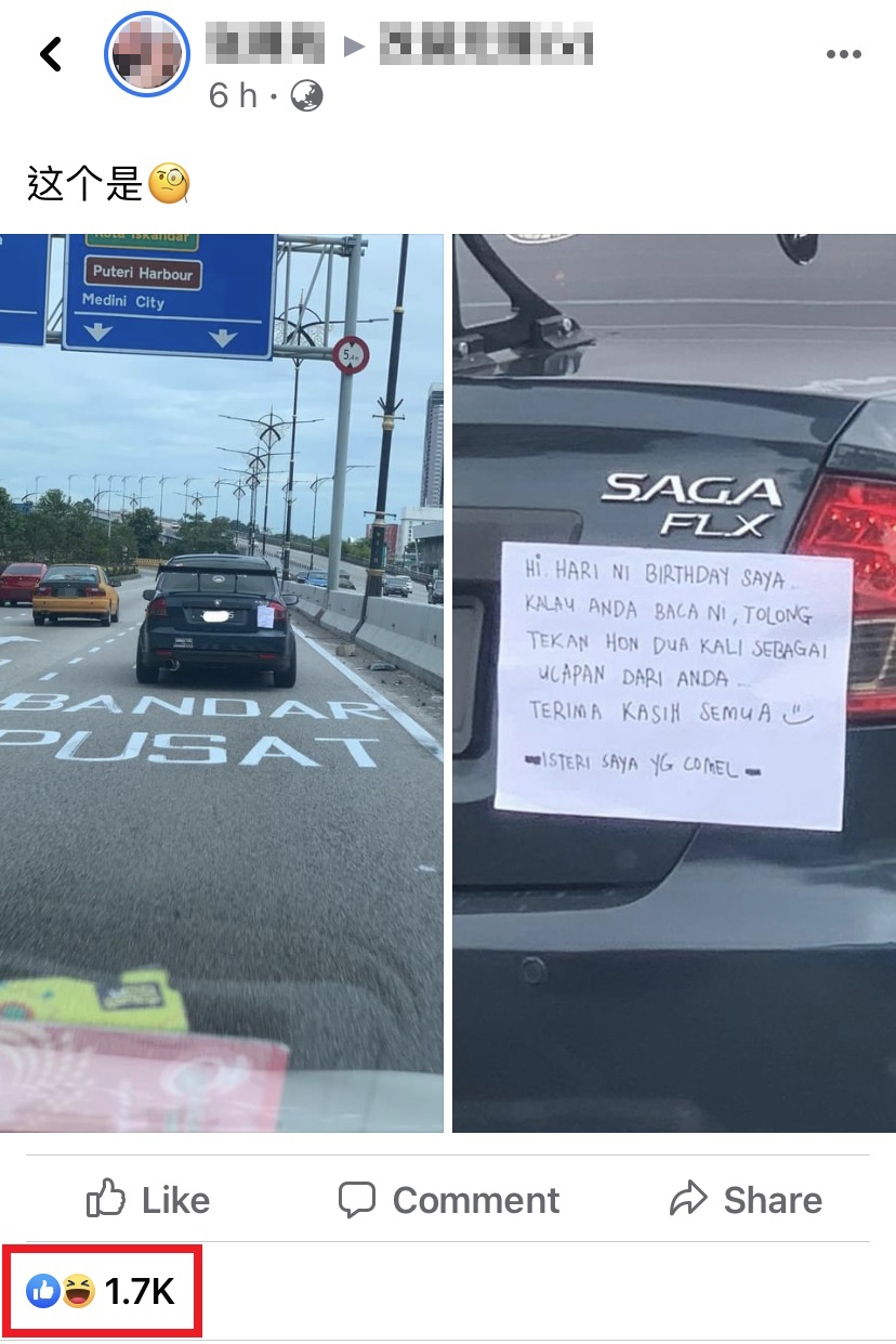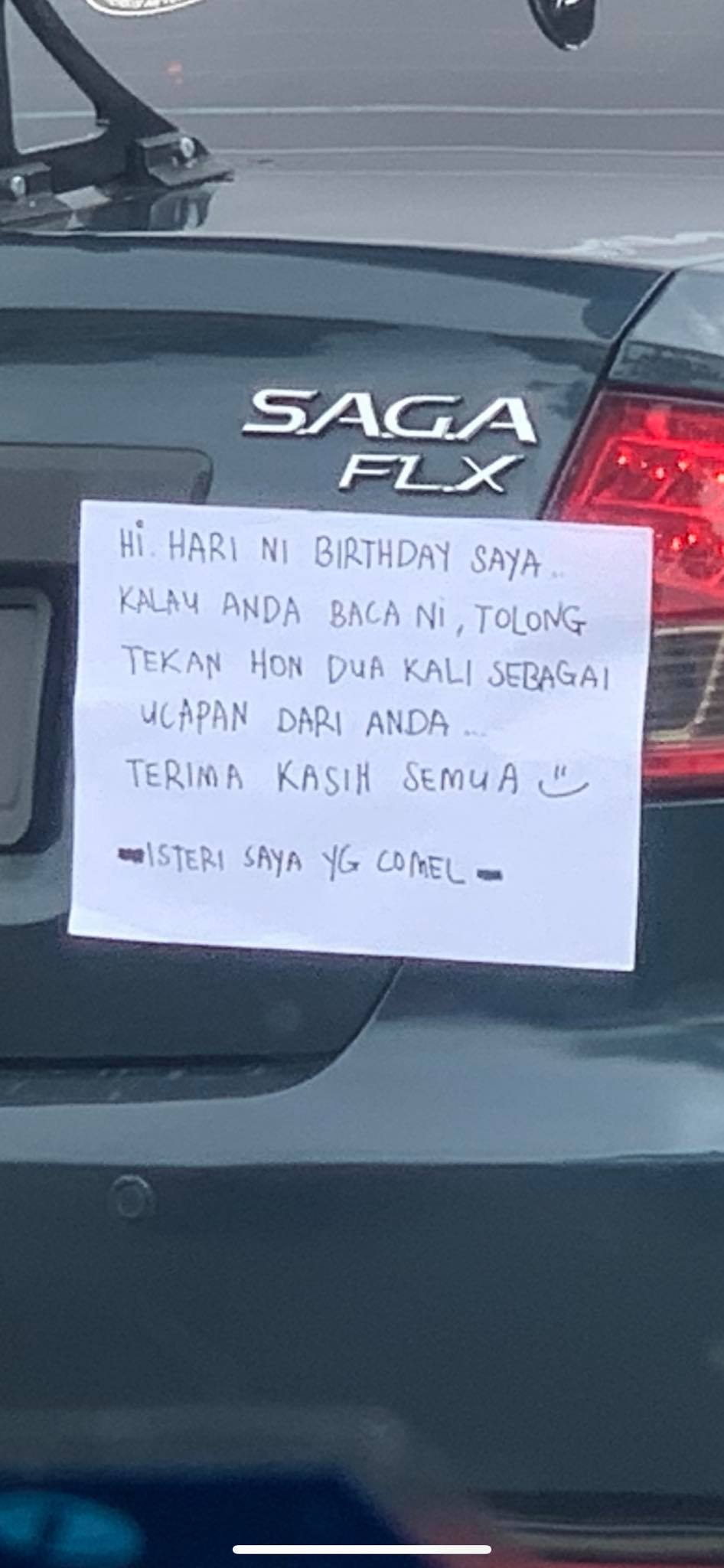 ▼ 据网民分享的照片来看,这起事件是发生在柔佛新山。近日,一辆深色的 Proton Saga 行驶在马路上时,车子后面贴了一张纸,车主却毫不知情。然而一路上,车主开始觉得不对劲,一直无端端地被路人“按horn”,尤其是来到路口和红绿灯时,喇叭声更是此起彼落!