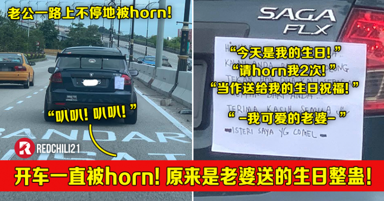 原来当天是车主的生日,“搞怪”的妻子在车后面贴了一张纸,请大家看到就“horn”他!