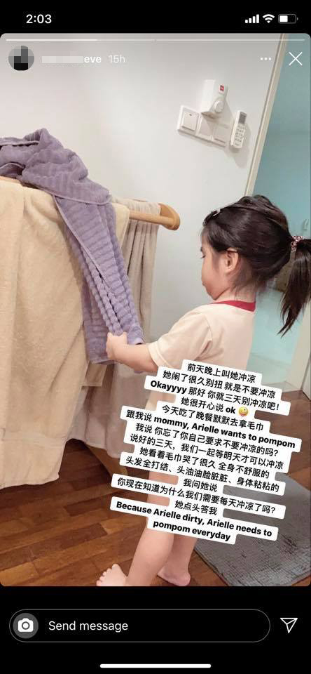 她看着毛巾哭了很久,全身不舒服的,头发全打结、头油油、脸脏脏、身体粘粘的。我问她说:「妳现在知道为什么我们需要每天冲凉了吗?」她点头答我:「Because Arielle dirty, Arielle needs to pompom everyday.(因为 Arielle 肮脏,Arielle 需要每天冲凉。)」
