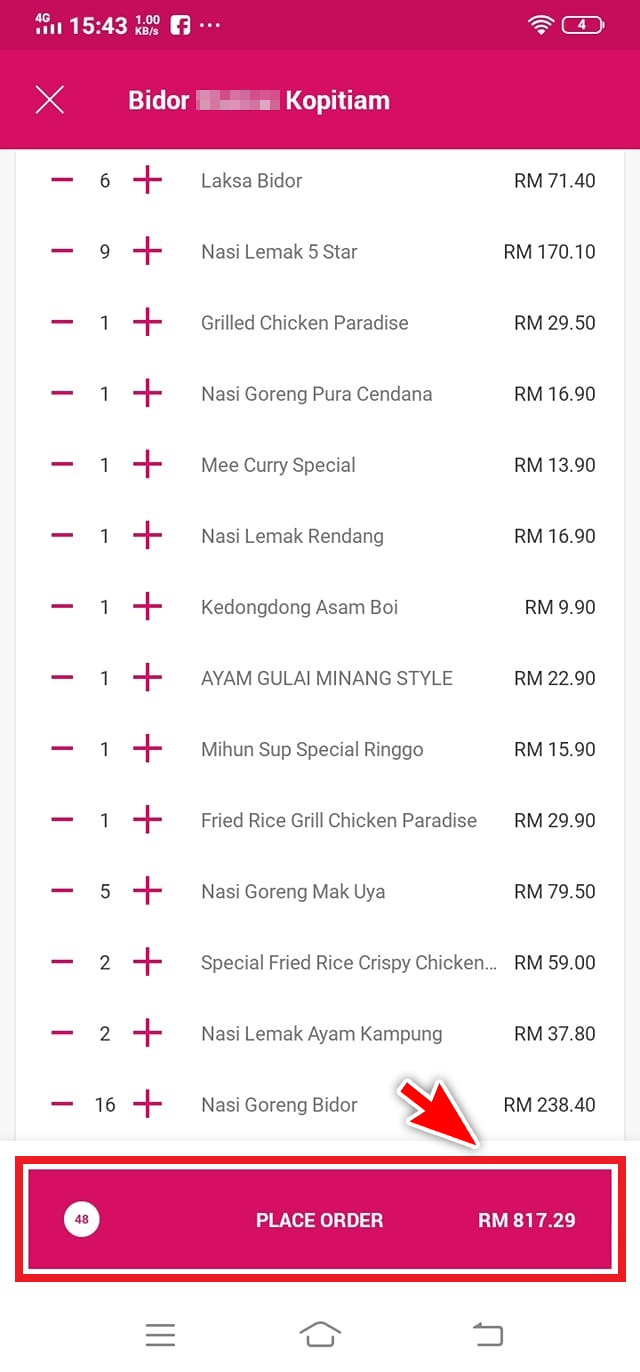 ▼ 据贴主所分享的手机截图,儿子在使用她手机的时候,擅自打开了 Foodpanda App,然后开始疯狂点餐!同一家餐厅他就选了几十份餐点放入购物车,其中最多的是 Nasi goreng(炒饭),多达16份,总额为 RM817.29!