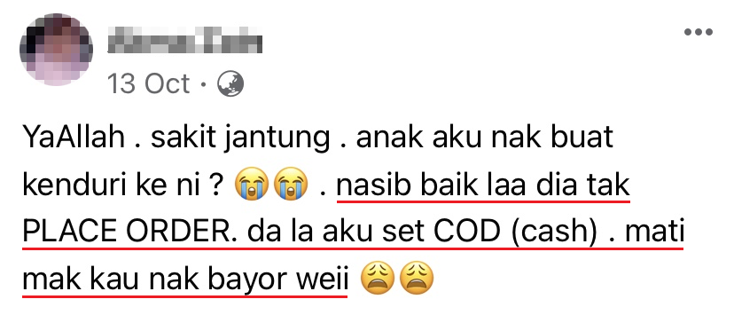 该帖文写道:「看到这个就心脏病!我的儿子是要办宴会吗?幸好他还没有按“Place order”(下单),我设置的是“Cash on delivery”(货到付款),如果你下了单,妈咪就要付钱付惨了!」