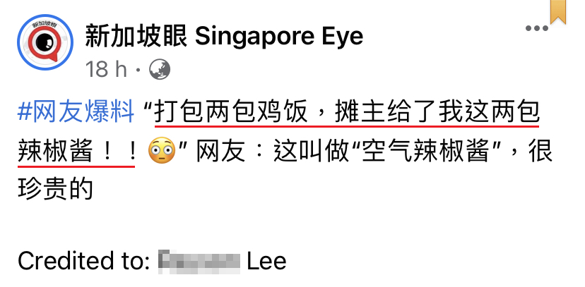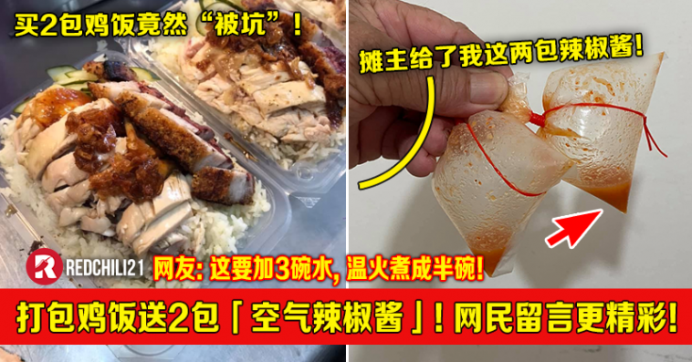 昨天新加坡面子书专页“新加坡眼”PO文分享了一名网友的爆料,指鸡饭摊主给了两包犹如空气般的辣椒酱,该帖子立刻掀起网友们的热烈讨论!