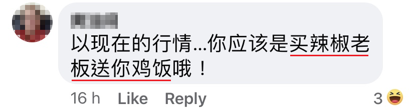 据帖子所写,这名网友日前到售卖鸡饭的摊位购买2包鸡饭,就和一般的鸡饭摊一样,老板附带了2包鸡饭的辣椒酱给顾客,然而重点来了!打开刚打包回来的鸡饭准备享用的时候,发现两包几乎是零重量的小包装,仔细一看原来是辣椒酱啊!