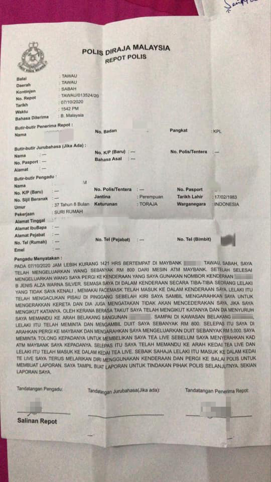 事主在 Maybank 提款机提出了 RM800 之后,正要上车的那一刻,突然被一名抢匪上车用刀劫持了他。抢匪叫事主把车驾去后面,打劫了她身上的 RM800。之后,贪得无厌的抢匪叫事主回头去 Maybank,再提出 RM5000 给他。