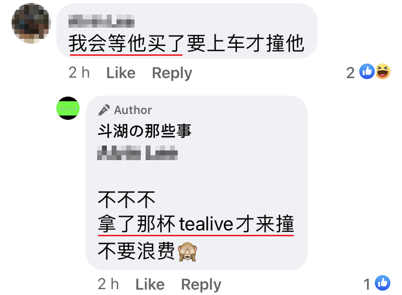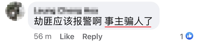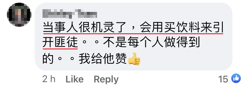就这样,事主载着抢匪开车前往 Tealive 的店,抢匪主动下车帮事主买 Tealive。就在这一刻,事主踩大油门,直接飞车去警察局。