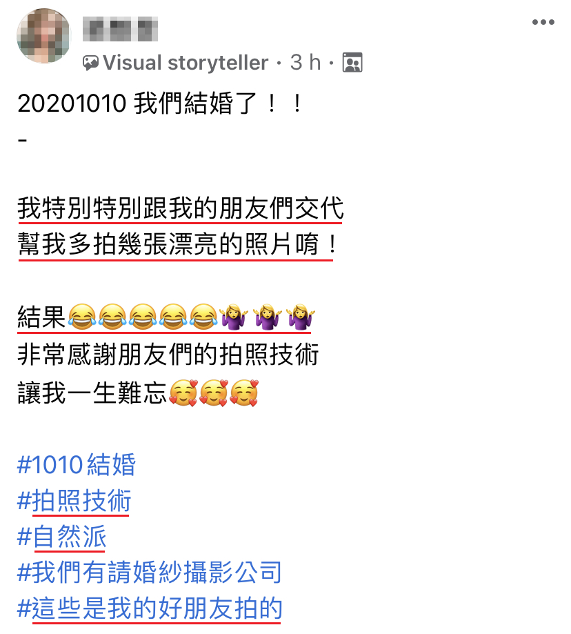 今天(10月12日)台湾一名女网友在面子书群组分享自己的结婚照,她在双10当天完成婚礼,当时她交代了朋友们帮忙拍美美的照片,结果事后看到的竟然是一张张丑到极致的新娘照,让她忍不住分享出来,给大家看看【朋友拍VS自己拍】的照片对比!