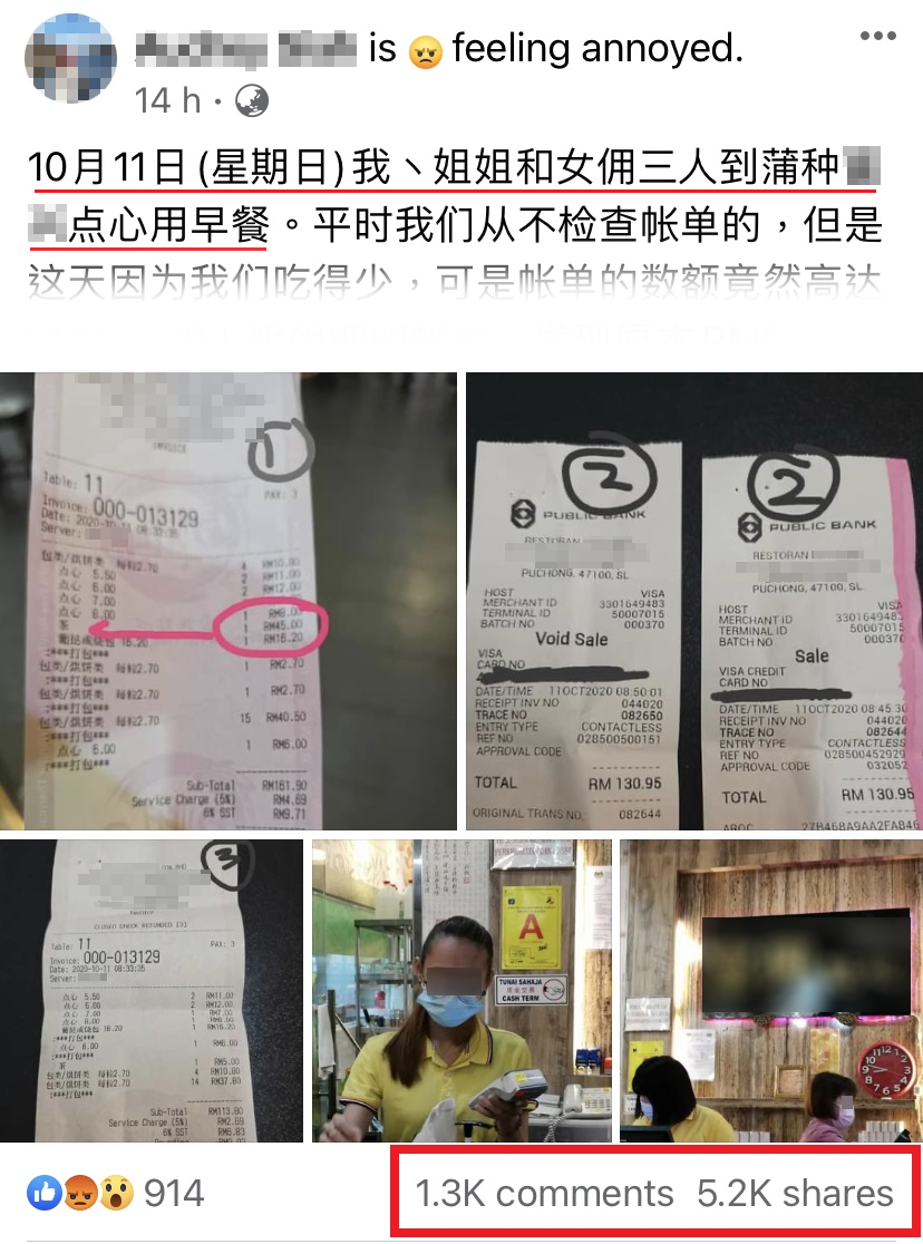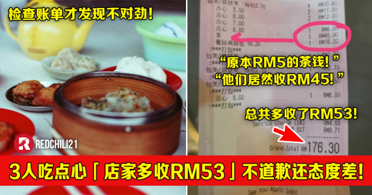 昨天(10月12日)一名大马女子在面子书PO文分享,到蒲种(Puchong)的一家著名点心餐馆吃早餐,结账时发现账单异常的贵,和柜台人员对质以后确认店家多算了多达 RM53 的金额,柜台人员不但没有道歉,态度还十分不好!